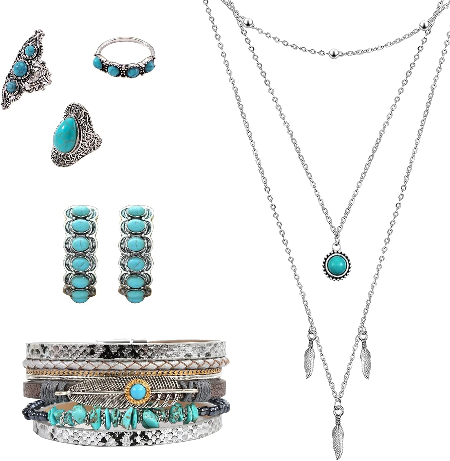 3 Pcs Western Jewelry for Women,Bohemian Turquoise Dangle Earrings,Bullhead Pendant Layered Choker,Boho Faux Leather Wristband,Country Concert Cowgirl Accessories,Jewelry for Women