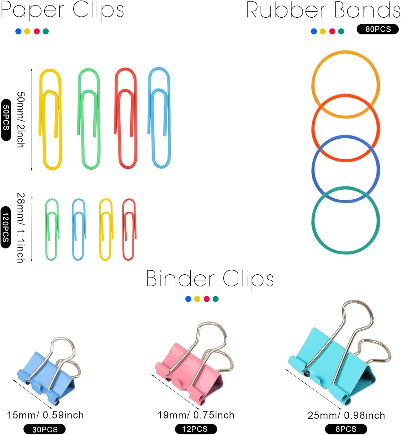 300 Pcs Binder Clips, Rubber Bands, Office Set, Paper Clips, School & Teacher Supplies for Office Desk Essentials (Assorted Sizes)