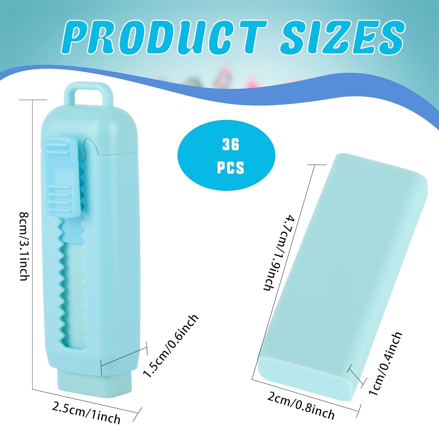 【Size Details】: each retractable eraser case measures approx. 8 x 2.5 x 1.5 cm/ 3.15 x 0.98 x 0.59 inch, while the eraser inside is 4.7 x 2 x 1 cm / 1.85 x 0.79 x 0.39 inch, making them compact and easy to store. These stick erasers retractable are great for pencil cases, desk drawers, or on-the-go use