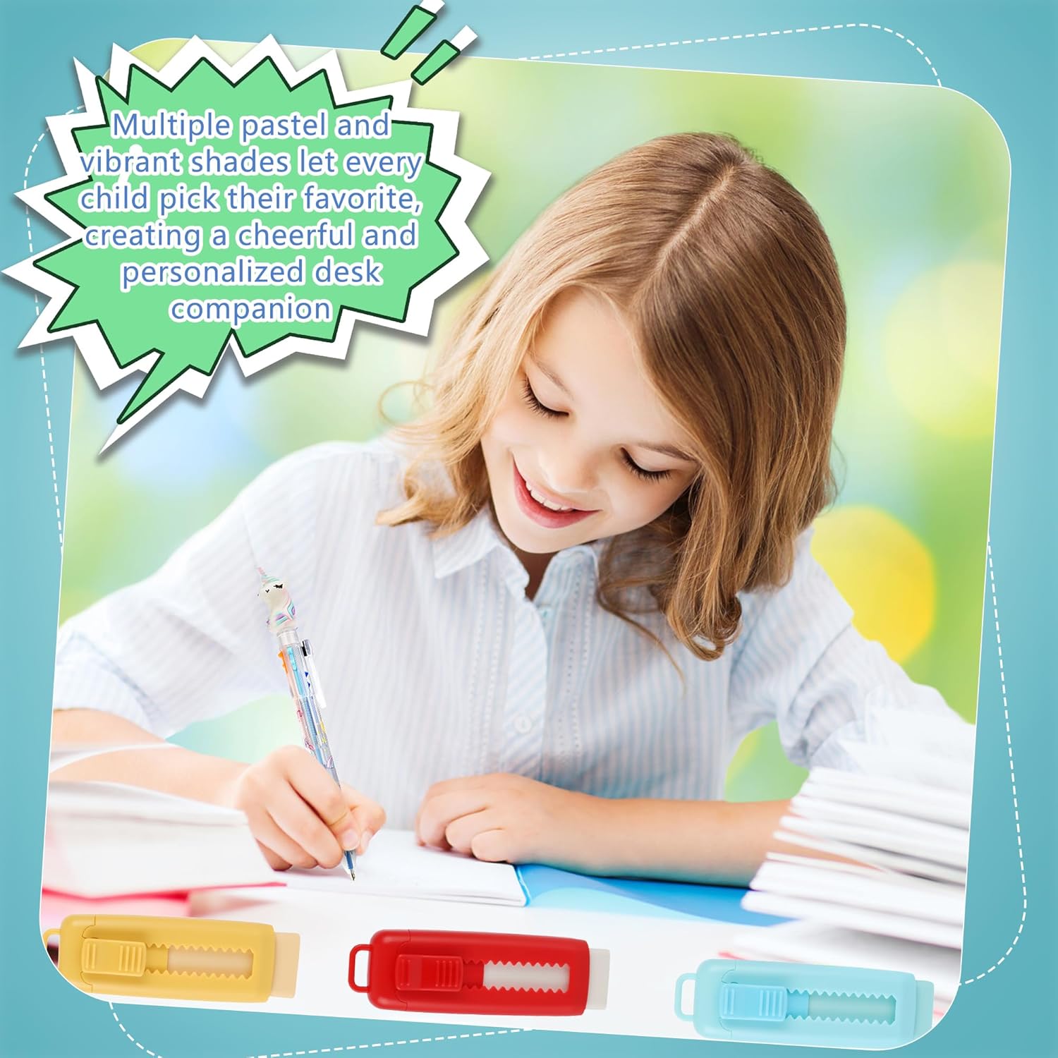 these solid color erasers for kids are perfect for schoolwork, journaling, sketching, note-taking, or office use. Their simple, clean color scheme adds a touch of modern style to any stationery collection and is suitable for all ages