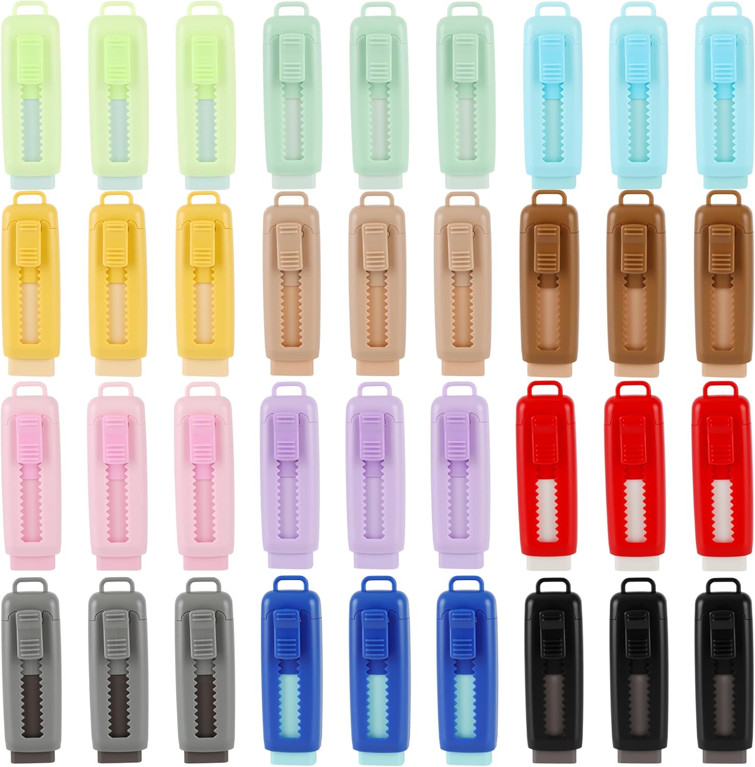【Package Includes】: each set contains 36 retractable erasers in 12 solid colors, 3 of each color. These school erasers are perfect for classroom supplies, back-to-school supplies, party favors, or everyday use. They are perfect for sharing or giving as gifts