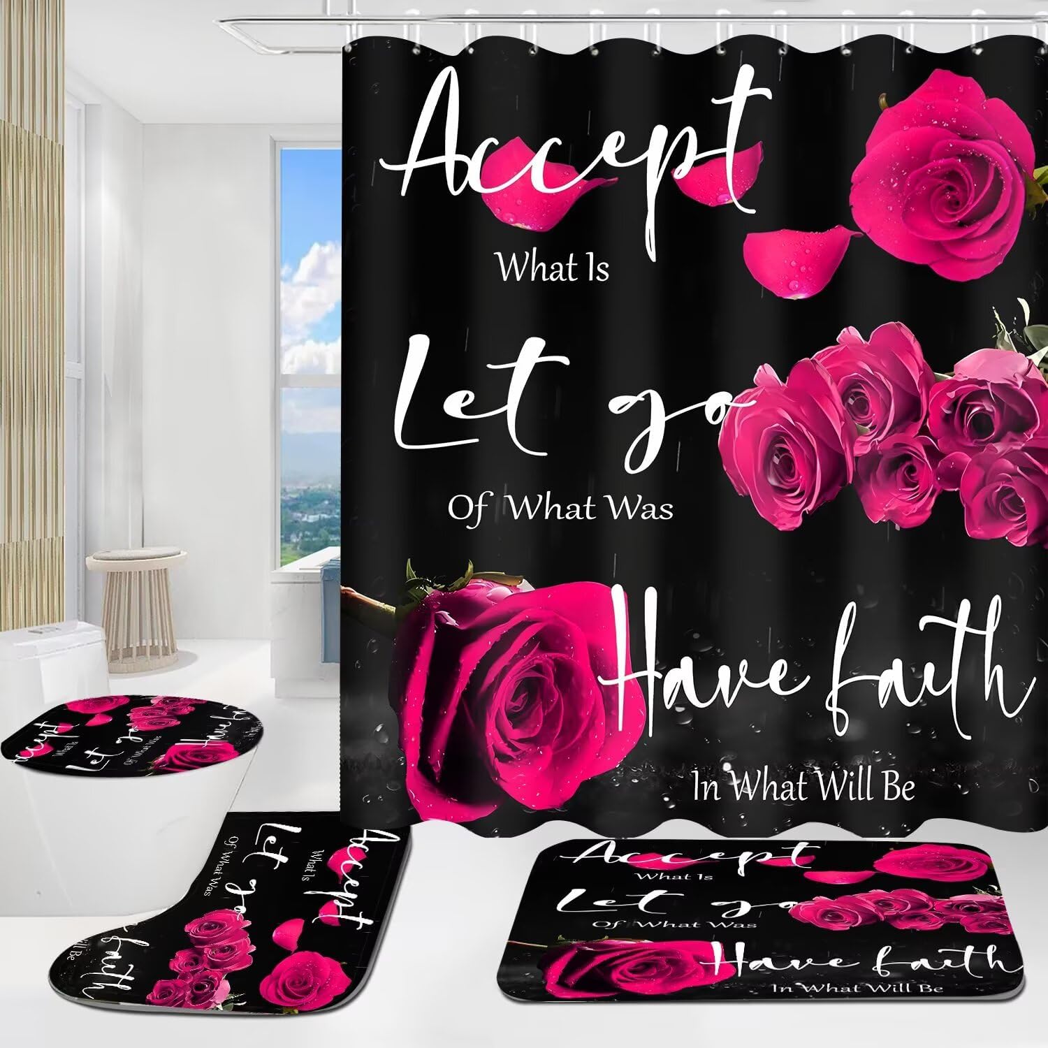 [ MATERIAL]: This Pink rose shower curtain set is made of environmentally friendly polyester fabric,The non-slip bath mat/U type rug are made of high-quality sponge, flannel and non-slip bottom, with absorption and quick drying.