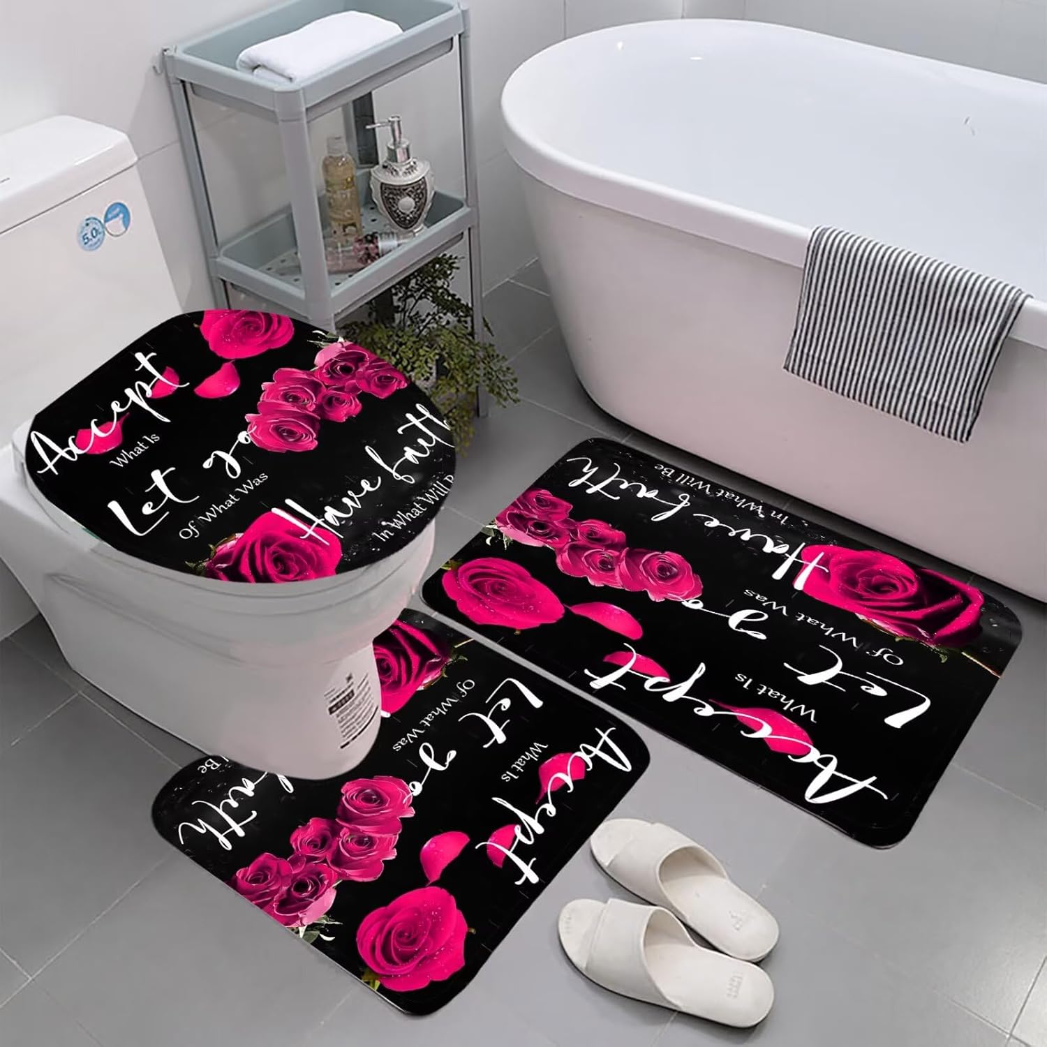 [WATERPROOF ]: The romantic rose Bathroom rug and mat set are made of premium flannel which is soft and when you step right out of the bath or shower, you will feel step onto a cloud! Strong Adhesion which can stick to the floor and it won’t run away. they can absorb water in few seconds and protect your floor from moisture.