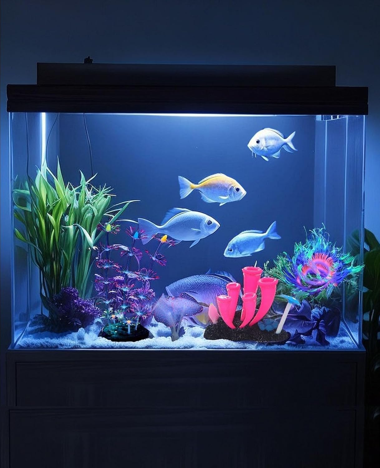 GLOW UNDER EXTRA LIGHTS: These Charming Aquarium Décor ornaments don’t glow automatically in the dark,The Glowing Effect will only happen under actinic lighting.We recommend blue & white light, blue light or purple light to get better effect.Not “Glow In the Dark”!