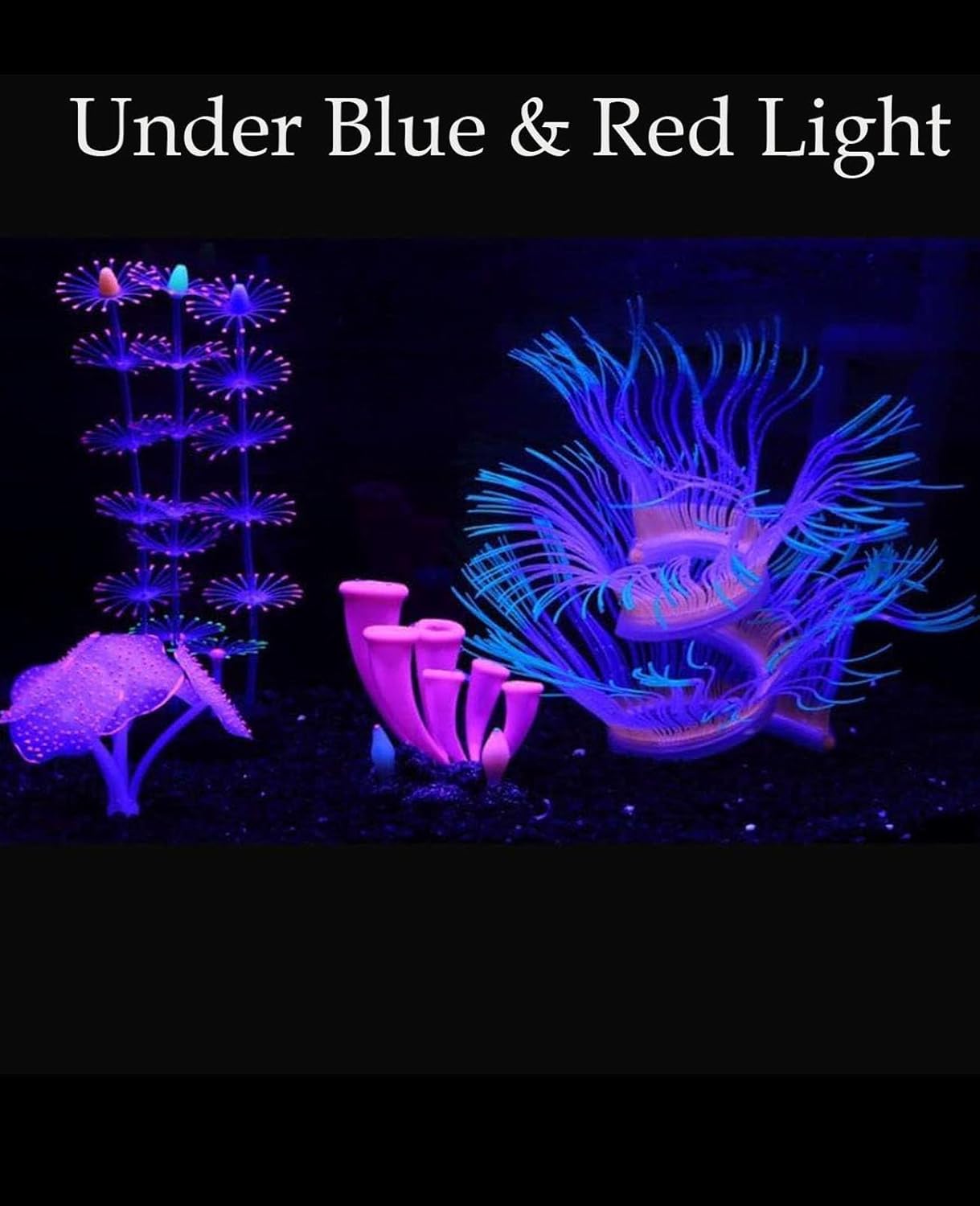 PACKAGE CONTENTS : You will get 4 pieces glowing aquarium fish tank decorations, including 1 piece glowing feather coral,1 piece pink glowing sucker coral ,1 piece green glowing anemone and 1 pieces of artificial Glowing Horn Coral