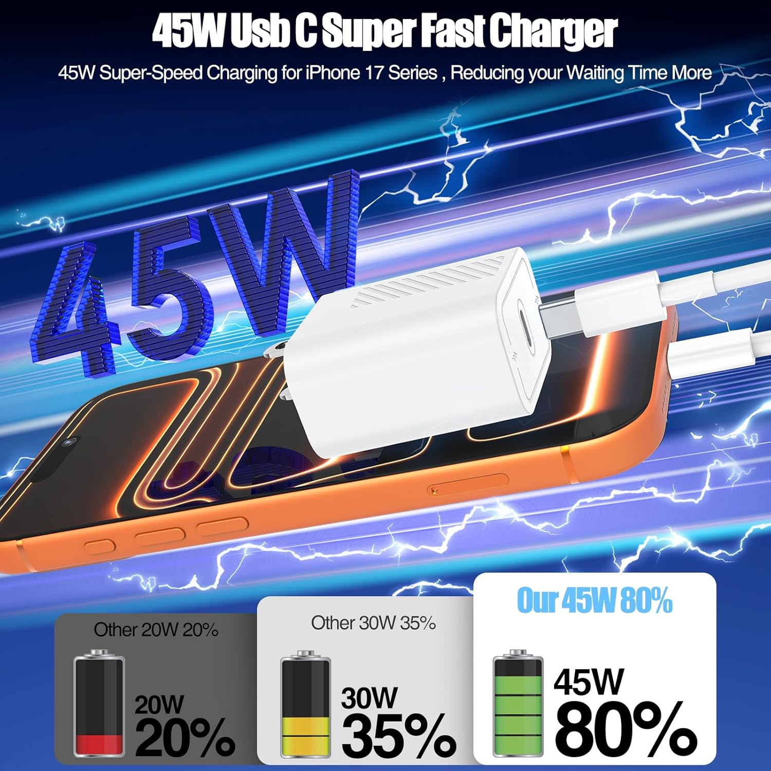 【45W for iPhone 17 Series Charger】:45W for iphone USB C charging block utilizes upgraded PD 3.0 technology & Smart Chip to work together and reduce power consumption to quickly charge for iPhone 17/17 Pro/17 Pro Max/ Air, charging for iPhone 17 from 0% to 80% of its capacity in just 30 minutes, which is up to 6X faster than a standard USB charger