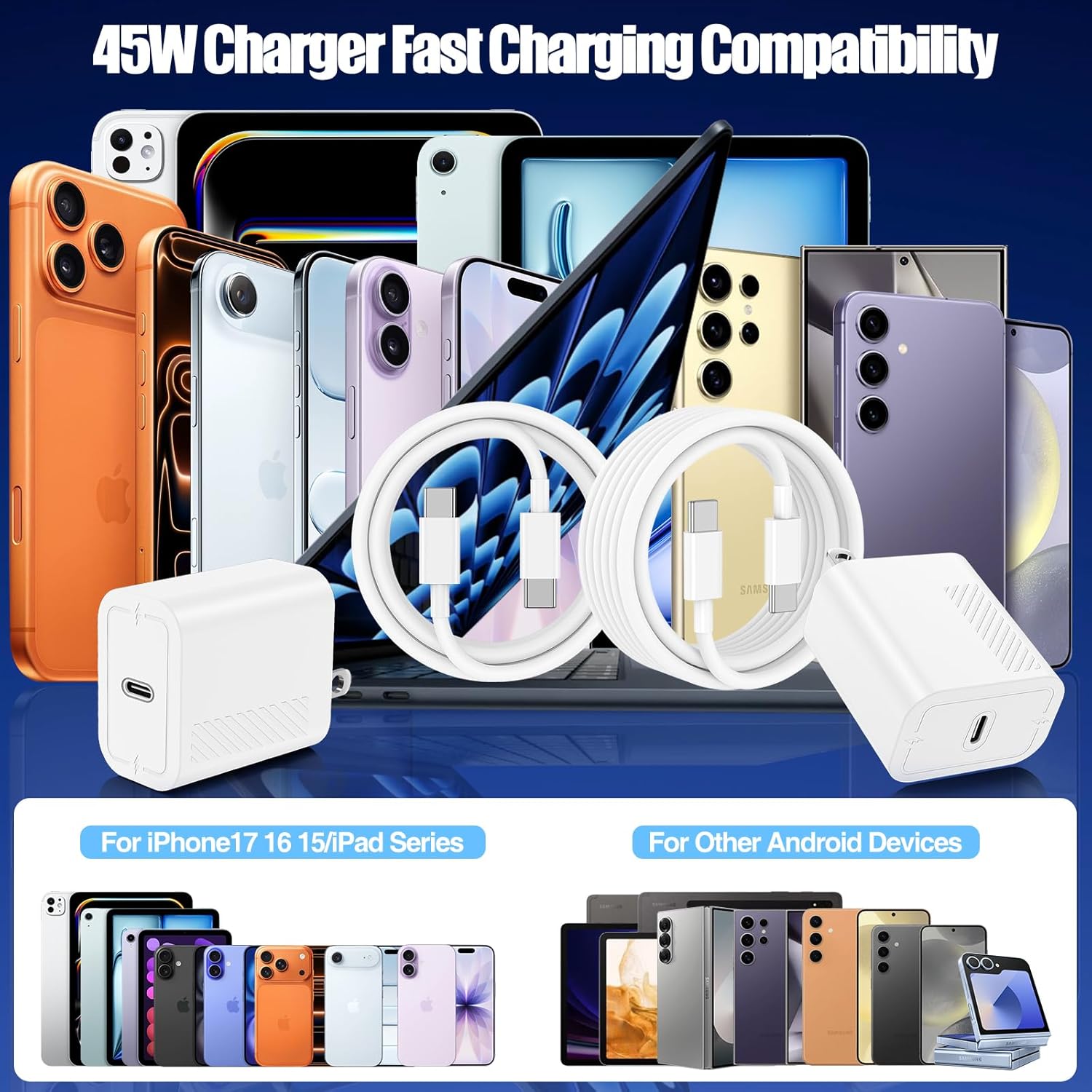 【For iPhone 17 Pro Max Charger Fast Charging Compatibility】: 45W charger with USB-C to C cable supports fast charging for iPhone 17/Air/17 Pro/17 Pro Max , for 16/16 Plus/16 Pro/16 Pro Max, 15/15 Plus/15 Pro/15 Pro Max, for iPad Pro 12.9 inch, for iPad Pro 11 inch, for iPad Air 5/4th generation, for iPad 10th generation, for iPad Mini 6, for AirPods Pro, for Samsung Galaxy S24, and more