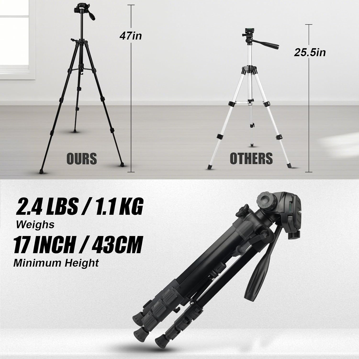 【Compact&Lightweight】Made from high-quality aluminum alloy, compact, portable and lightweight with collapsible legs. At only 2.5 lbs, the tripod is easy to store and transport in carry bag.