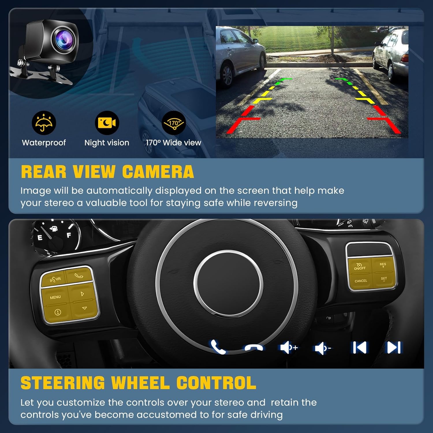 6. Rear view function: Support Rear view camera input, backing car more safer and convenient (Free camera come with stereo)