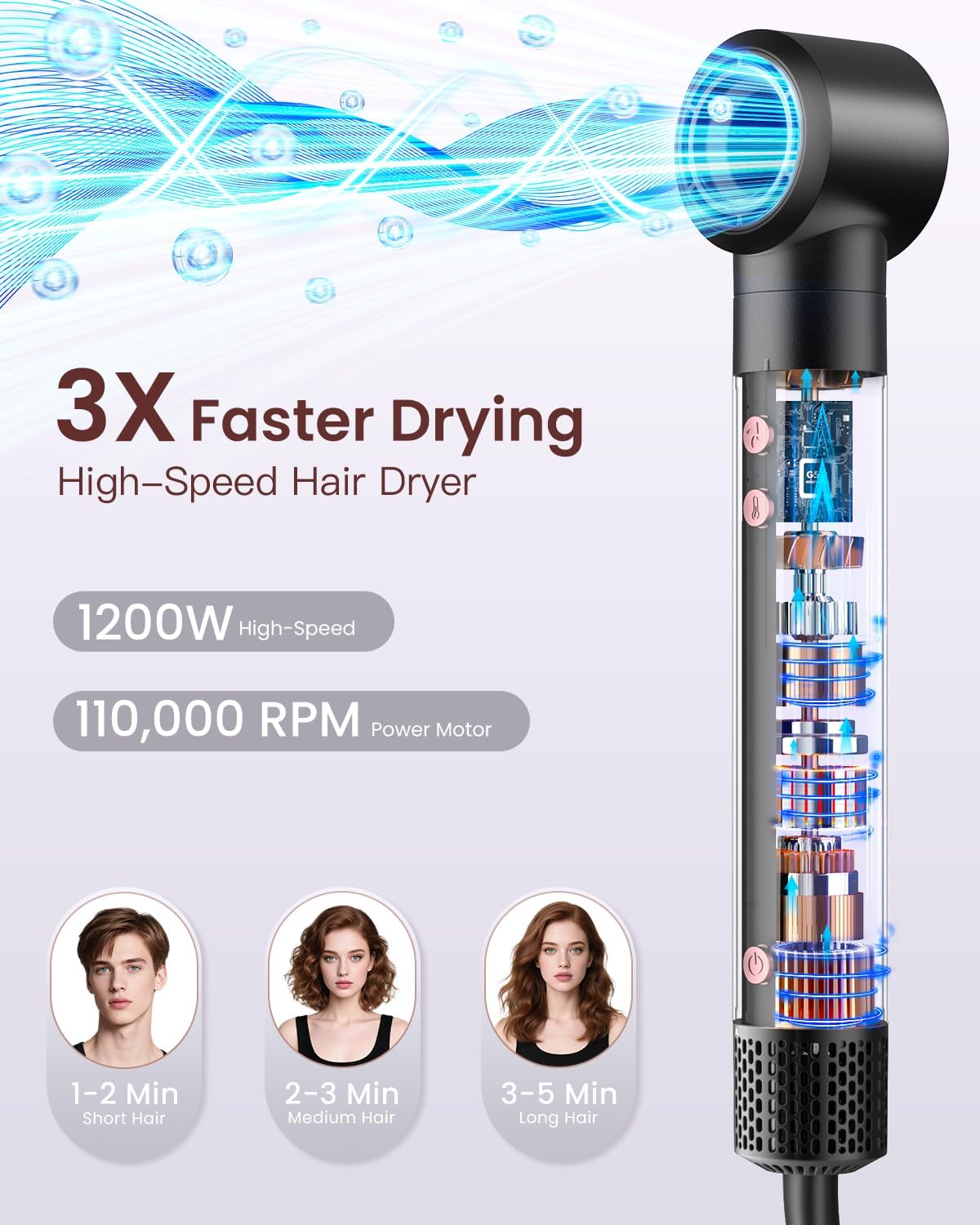 【High-Speed Motor for Fast Drying】Equipped with a 110,000 RPM high-speed motor that delivers strong airflow for ultra-fast drying and styling at the same time. Save time every morning while achieving full, voluminous results.