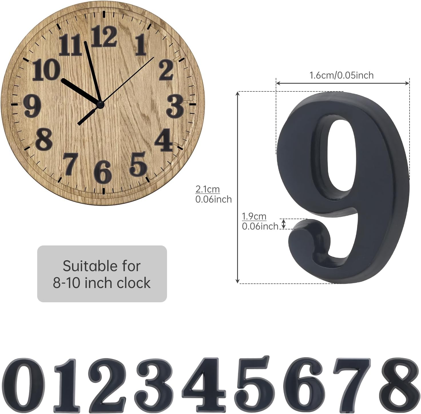 – Size. Each clock number size about 2 cm/ 0.78 inch high, 3 mm thick, suitable for 10 inch clock.
