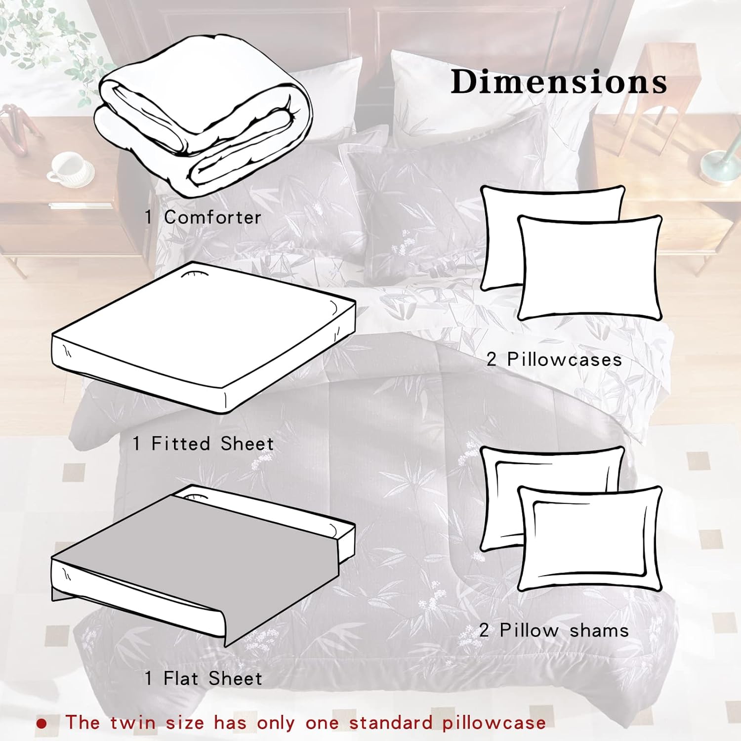7-Piece Bed in a Bag King Comforter Set with Sheets, Black Leaves Botanical Design Lightweight Bedding for All Season (1 Comforter, 2 Pillow Shams, 1 Fitted Sheet, 2 Pillowcases)