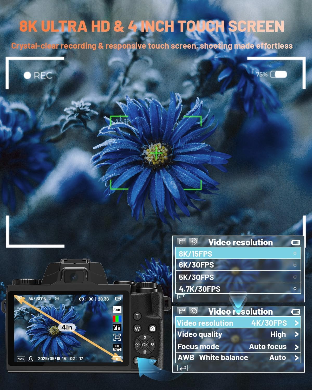 【Auto Focus & WiFi Sharing】 This 8K digital camera features advanced auto focus, ensuring clear and sharp images with every shot. Built-in WiFi allows you to easily transfer photos and videos or control the camera remotely through your smartphone—ideal for instant sharing and flexible shooting.