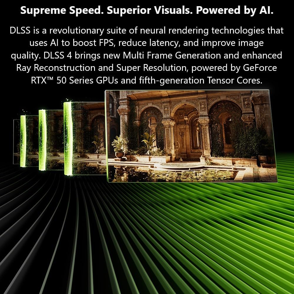 Supreme Speed. Superior Visuals. Powered by AI: DLSS is a revolutionary suite of neural rendering technologies that uses AI to boost FPS, reduce latency, and improve image quality. DLSS 4 brings a new Multi Frame Generation and enhanced Ray Reconstruction and Super Resolution, powered by GeForce RTX 50 Series GPUs and fifth-generation Tensor Cores.