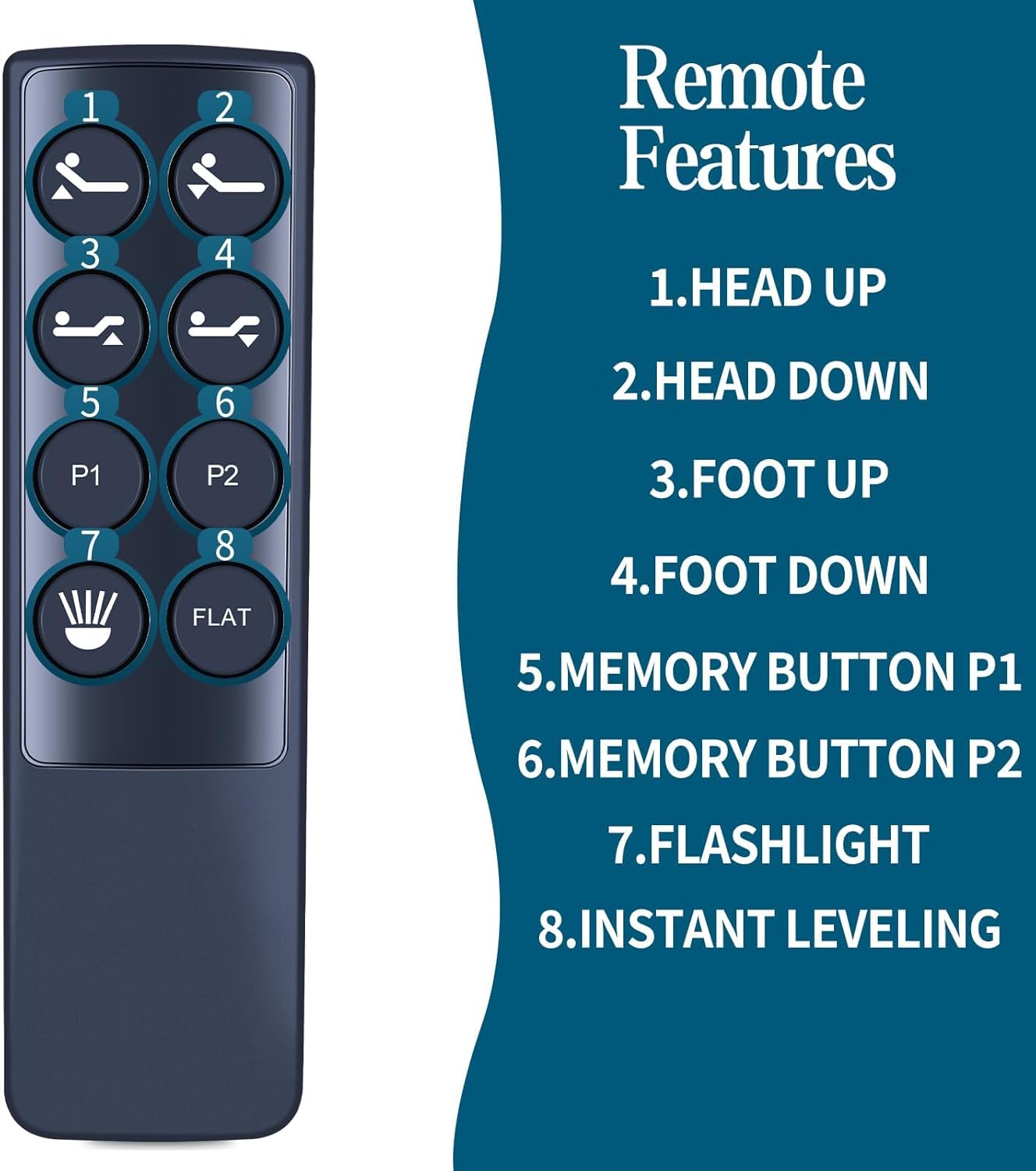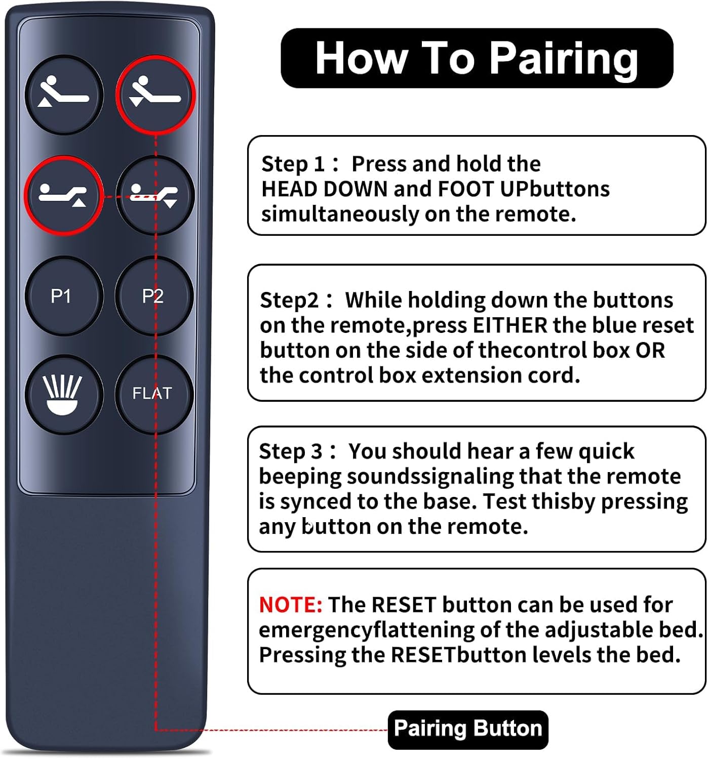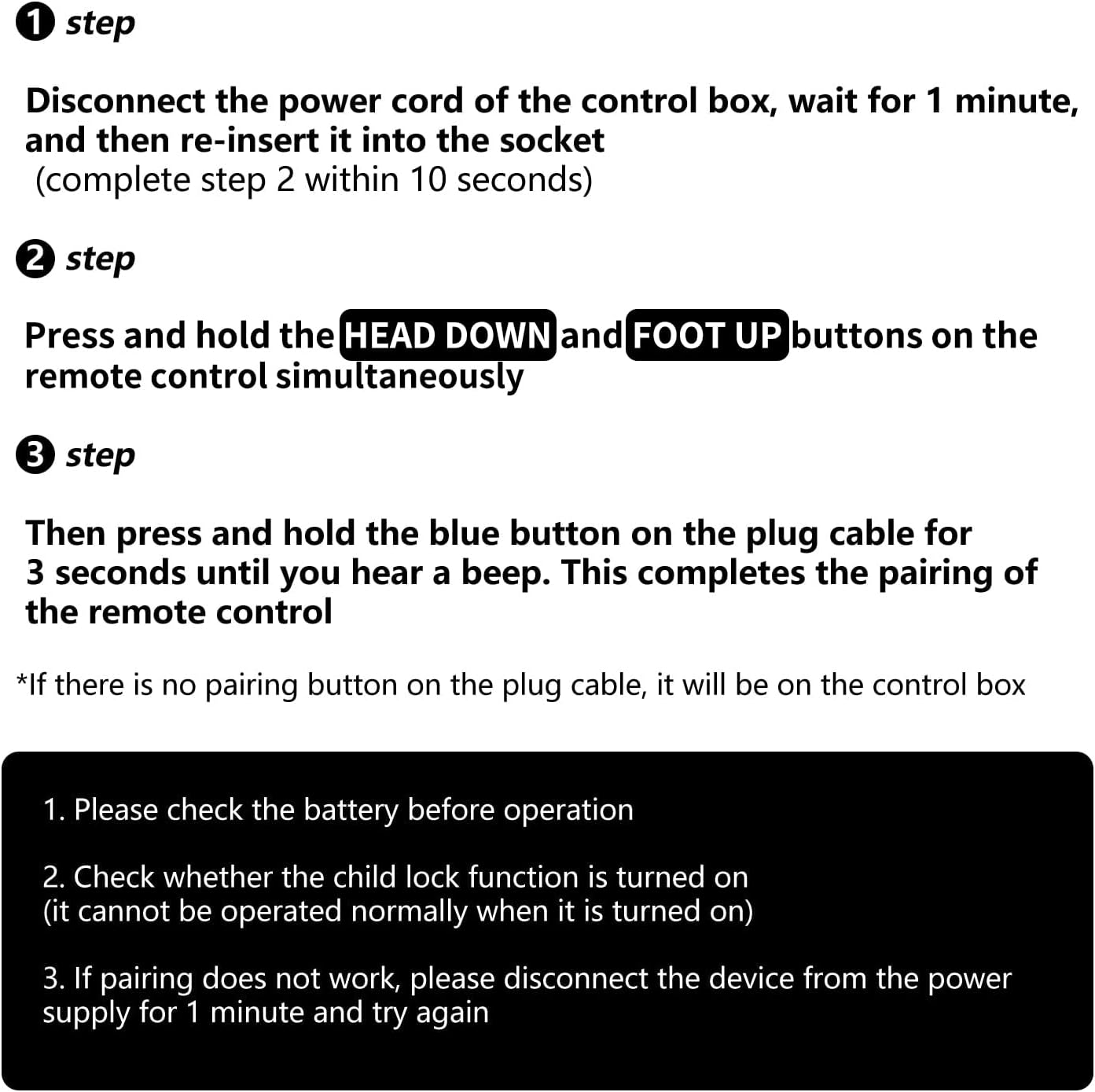 Please Set Before Use. Step1) Press and hold the HEAD DOWN and FOOT UP buttons simultaneously on the remote. Step2) While holding down the buttons on the remote,press EITHER the blue reset button on the side of thecontrol box OR the control box extension cord. Step3) You should hear a few quick beeping soundssignaling that the remote is synced to the base. Test thisby pressing any button on the remote.