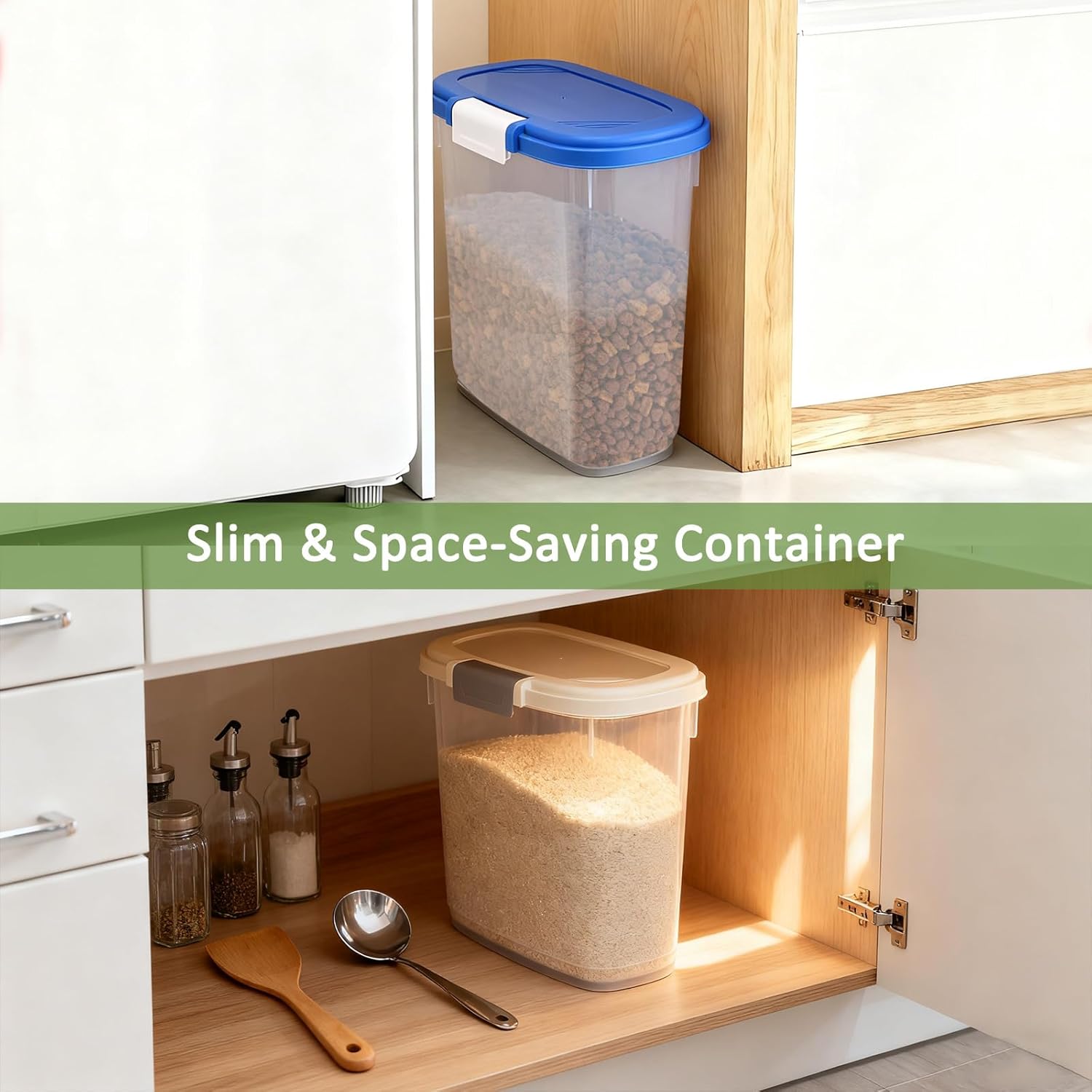 Tall and Slim, Space-Saving – Our dog food container is of slim and top shape for narrow area, cabinet and your pantry, making it easy to store and saving precious space in your home, keep organized