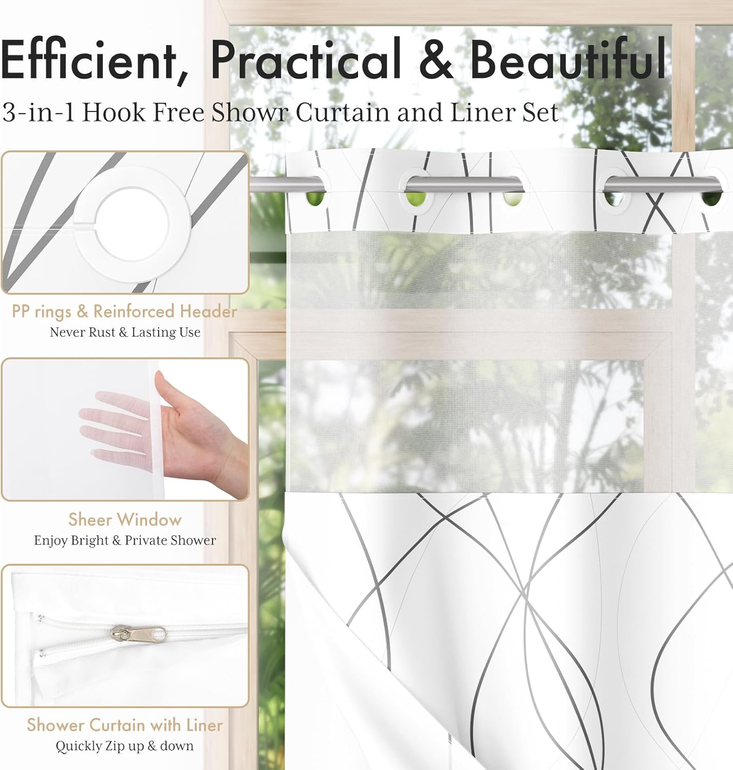 Smart & long-lasting 3-in-1 hook free shower curtain and liner: This shower curtain set combines built-in PP rings, shower curtain and detachable liner 3-in-1, providing a complete solution for bathtub. No rust, no tangles, no pop off, enjoy bathing