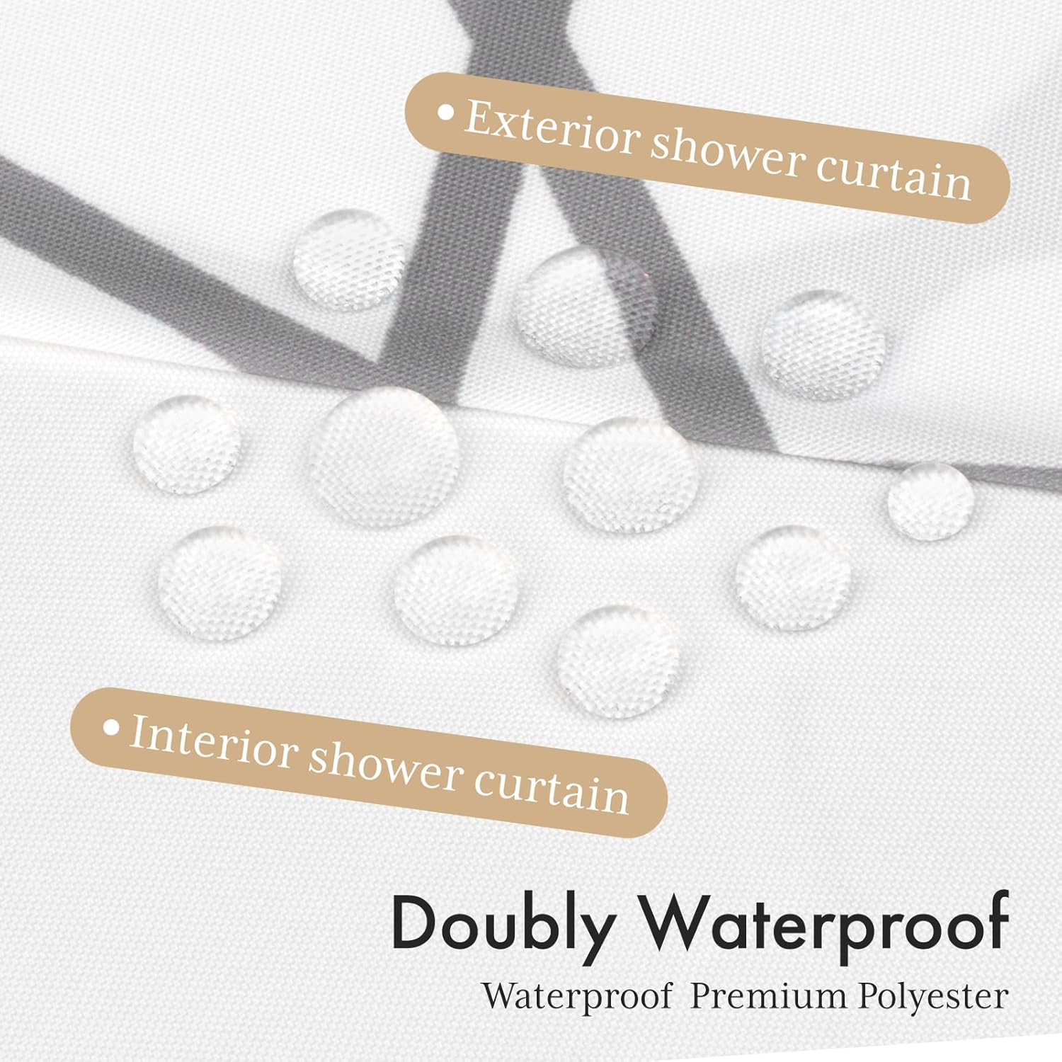 Doubly waterproof, nice drape: This waterproof fabirc shower curtain and liner are both designed with premium waterproof material. The bottom corners are equipped with 2 heavy stones to enhance the drape of the shower curtain modern and prevent splashing water