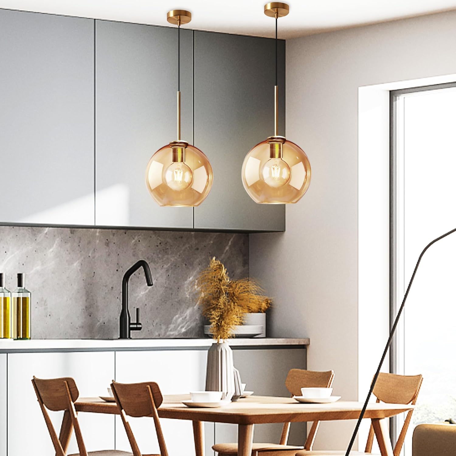 Amber Glass Pendant Lights Kitchen Island Lighting Globe Pendant Light Fixtures Modern Pendant Lighting for Kitchen Island Bedroom Living Dining Room Light Fixture(7.9in, 2-Pack)