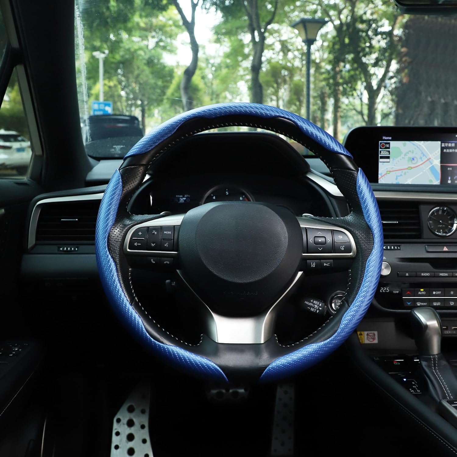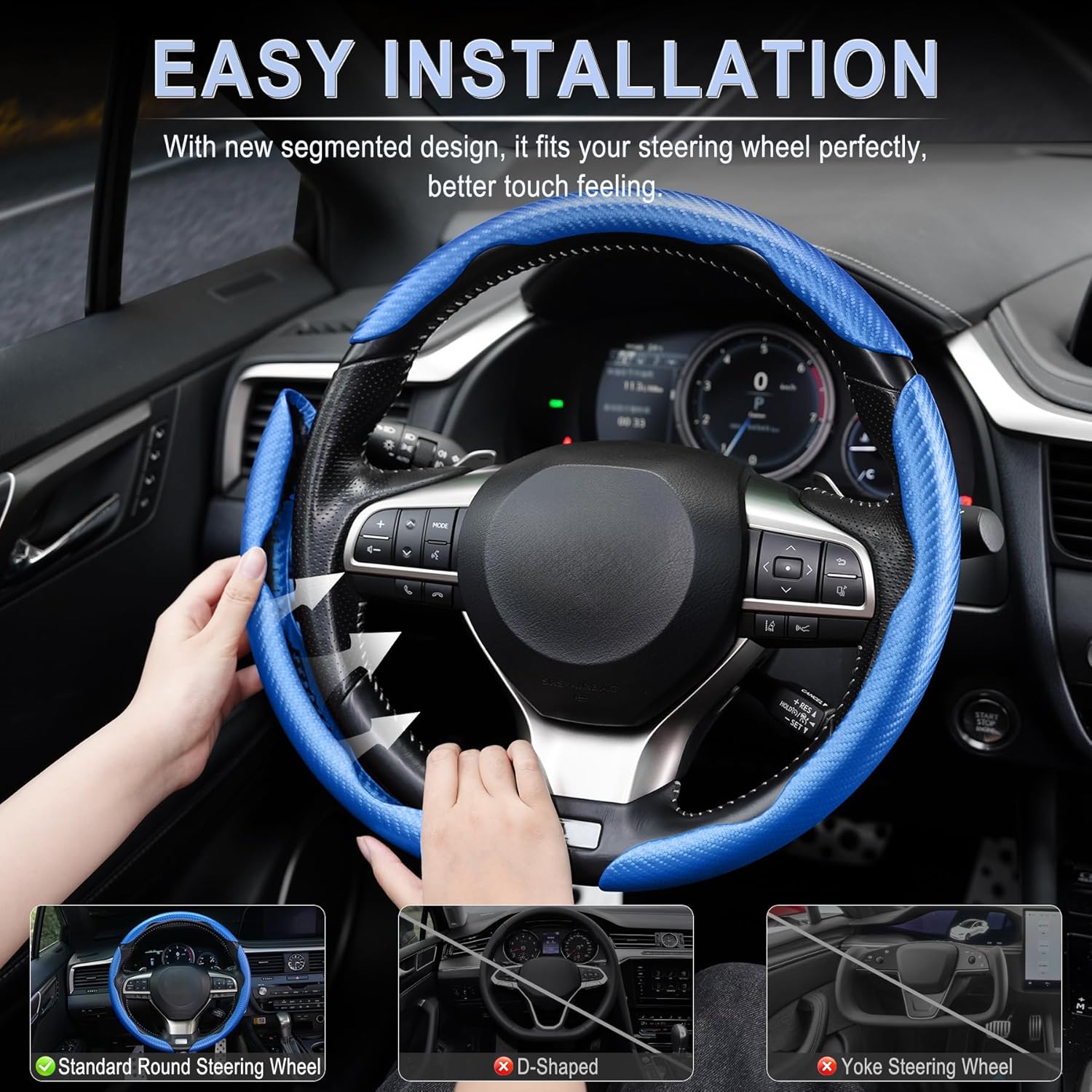 Amiss 3pcs Carbon Fiber Anti-Skid Steering Wheel Cover, Waterproof & Segmented Butterfly Design, Universal 99% Vehicle Wheel Cover Protector, Car Interior Accessories, Blue