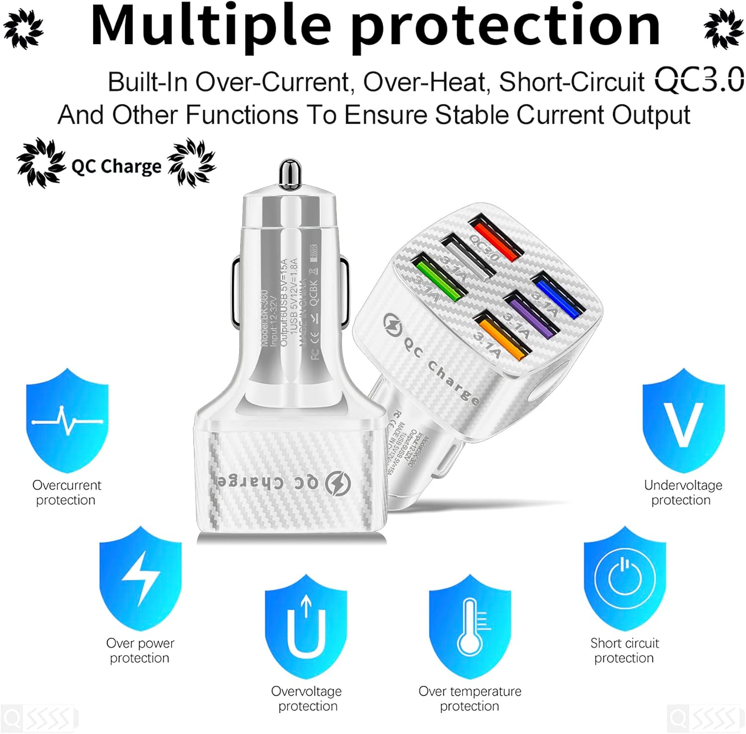 Amiss Car Charger Adapter, 6 USB Multi Port, Fast Charger, Include QC 3.0 and 5 Other Ports, Car Interior Accessories, Fit for iPhone 13/12/11/pro, Samsung Galaxy/Note S10/S9/S8 – White(2PCS)