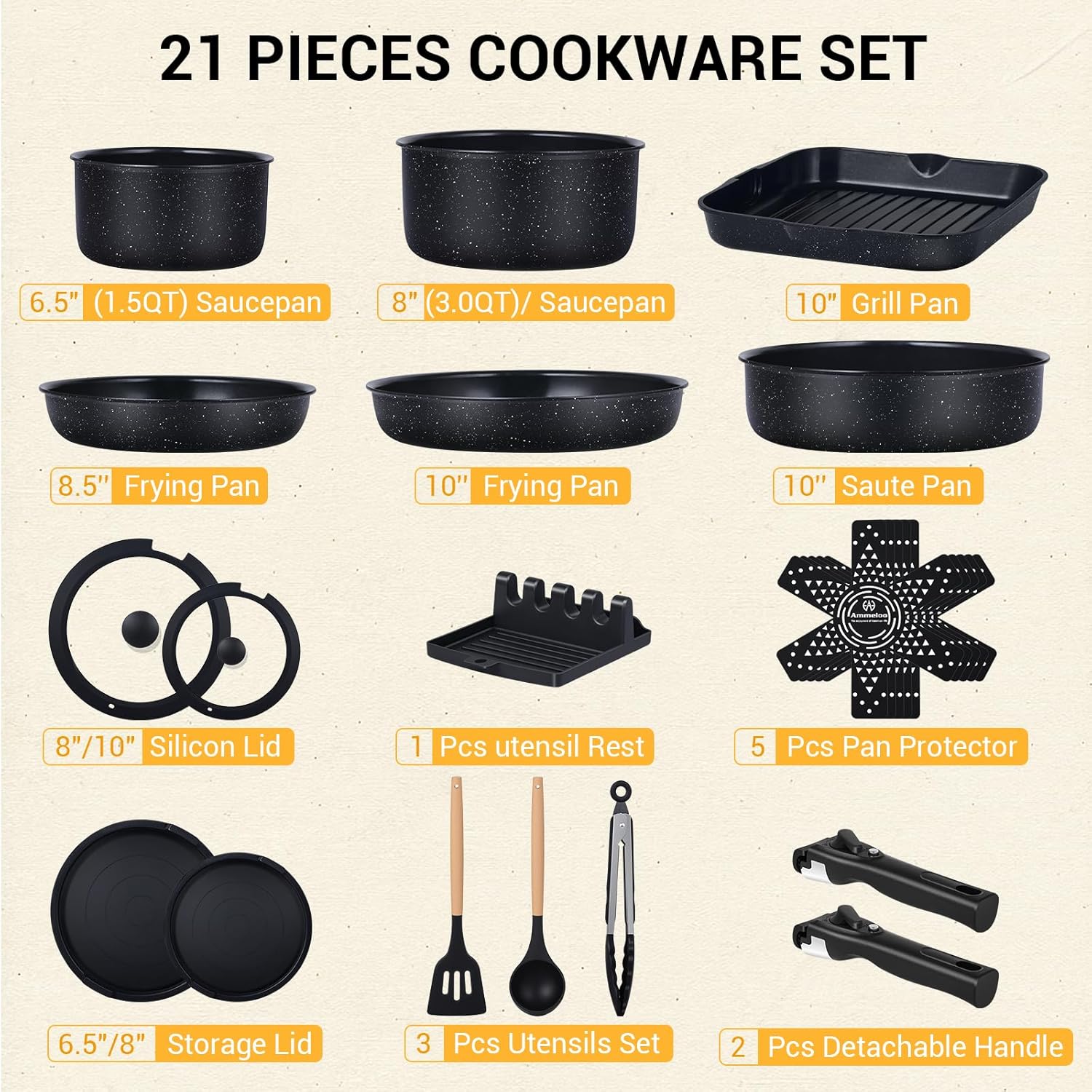 Ammeloo 21 Pcs Pots and Pans Set Non Stick with Detachable Handle & Grill Pan, Induction Ceramic Cookware Set, Non Toxic Kitchen Pots and Pans Set for RVs,Camping, Oven/Dishwasher Safe, Black