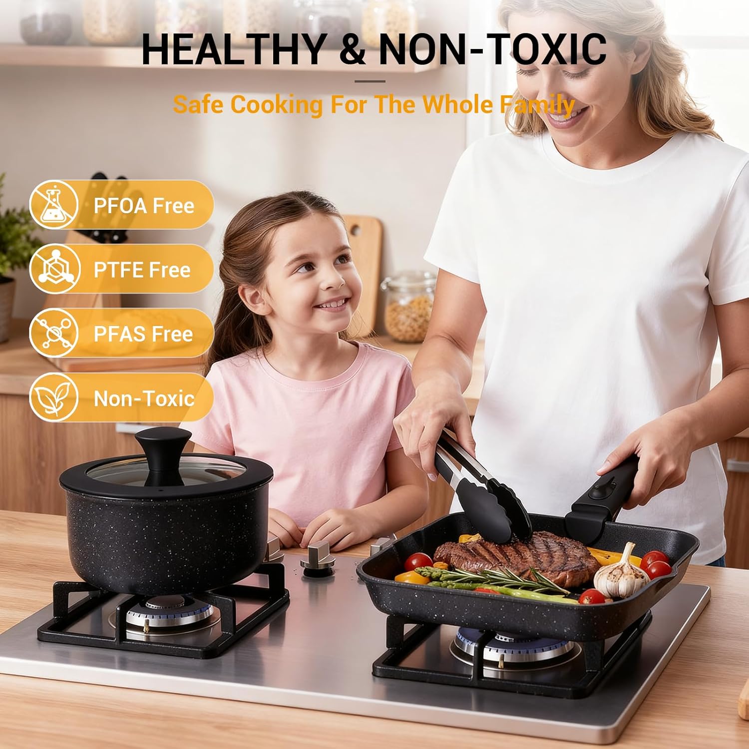 Non-Toxic & Family-Safe:Ammeloo nontoxic pots and pan set is crafted without PFOA, PTFE, PFAS, lead and cadmium, offering a completely healthy cooking experience. As a truly safe nontoxic cookware set, it’s ideal for preparing meals for the whole family—especially babies and kids. Cook confidently and serve toxin-free dishes every day.”