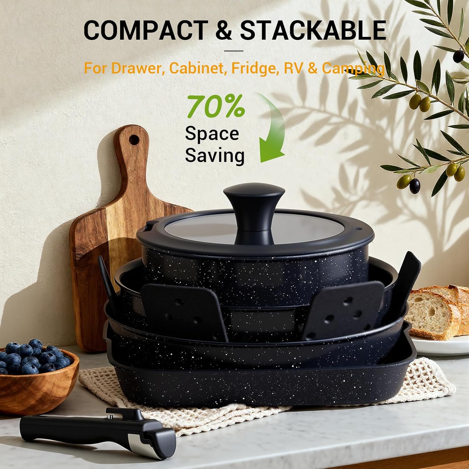 Space-Efficient Stacking Design:Maximize your storage with Ammeloo innovative stackable pots and pans set. The removable handle and compact design save 70% more space, letting you store cookware in drawers, cabinets, RVs, and even refrigerators with the lid on. A must-have for campers and small-space living.
