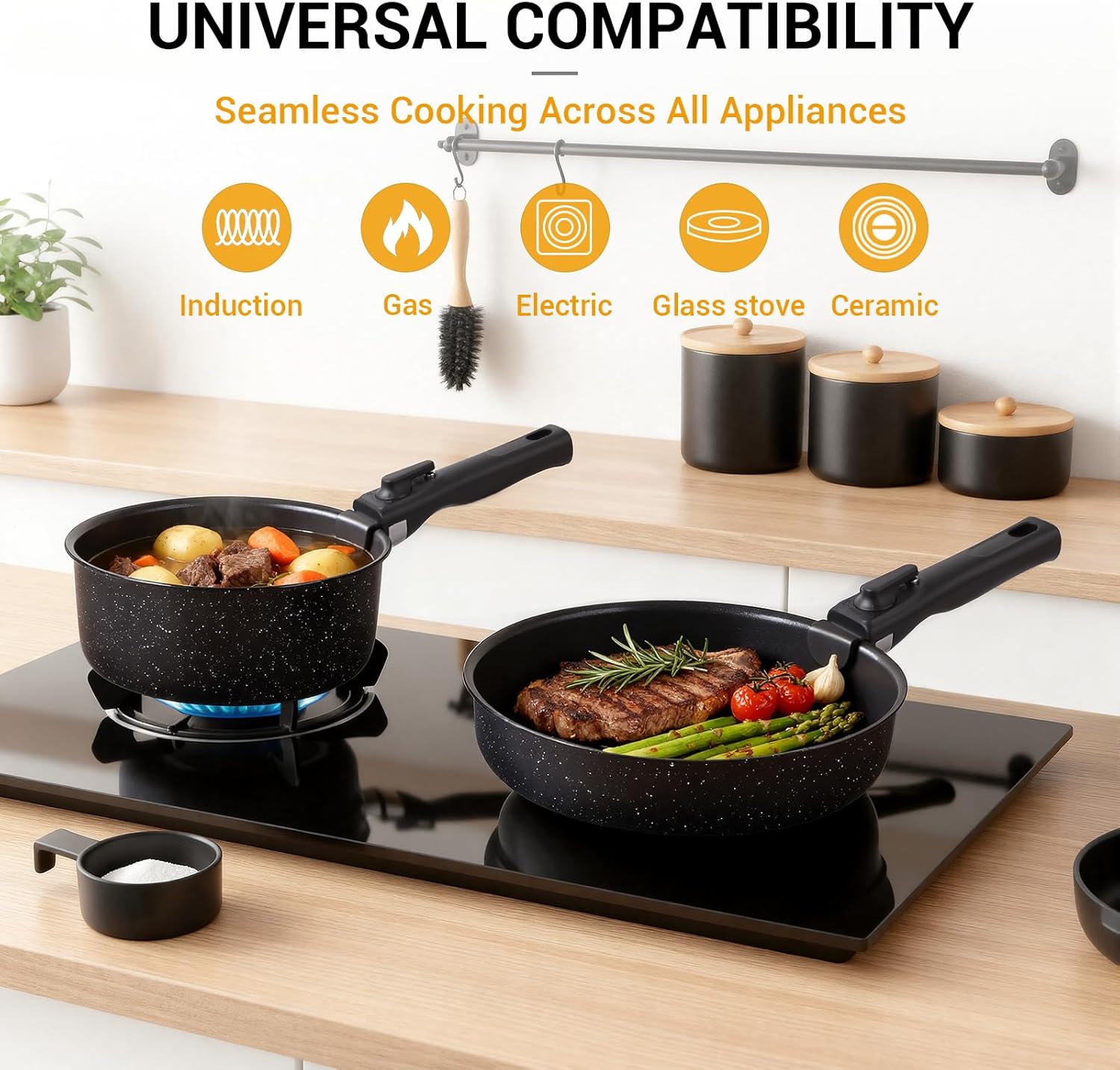 Secure Detachable Handle:The detachable handle on Ammeloo pots and pans set features an secure locking system for total control and safety. It supports up to 25 pounds and is tested for reliability. Detach it instantly to save space—perfect for organized storage or taking your cooking outdoors.