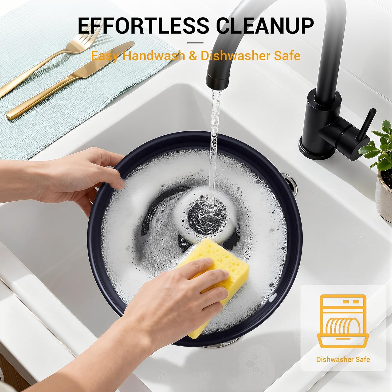 Ceramic Nonstick Coating:The Ammeloo ceramic cookware set makes cooking effortless with its advanced nonstick surface, along with a durable, scratch-and-stain-resistant coating for lasting performance.This pots and pans set non stick requires less oil for healthier, low-fat meals. Cleaning is quick and requires just a gentle wipe—less soaking or no scrubbing.