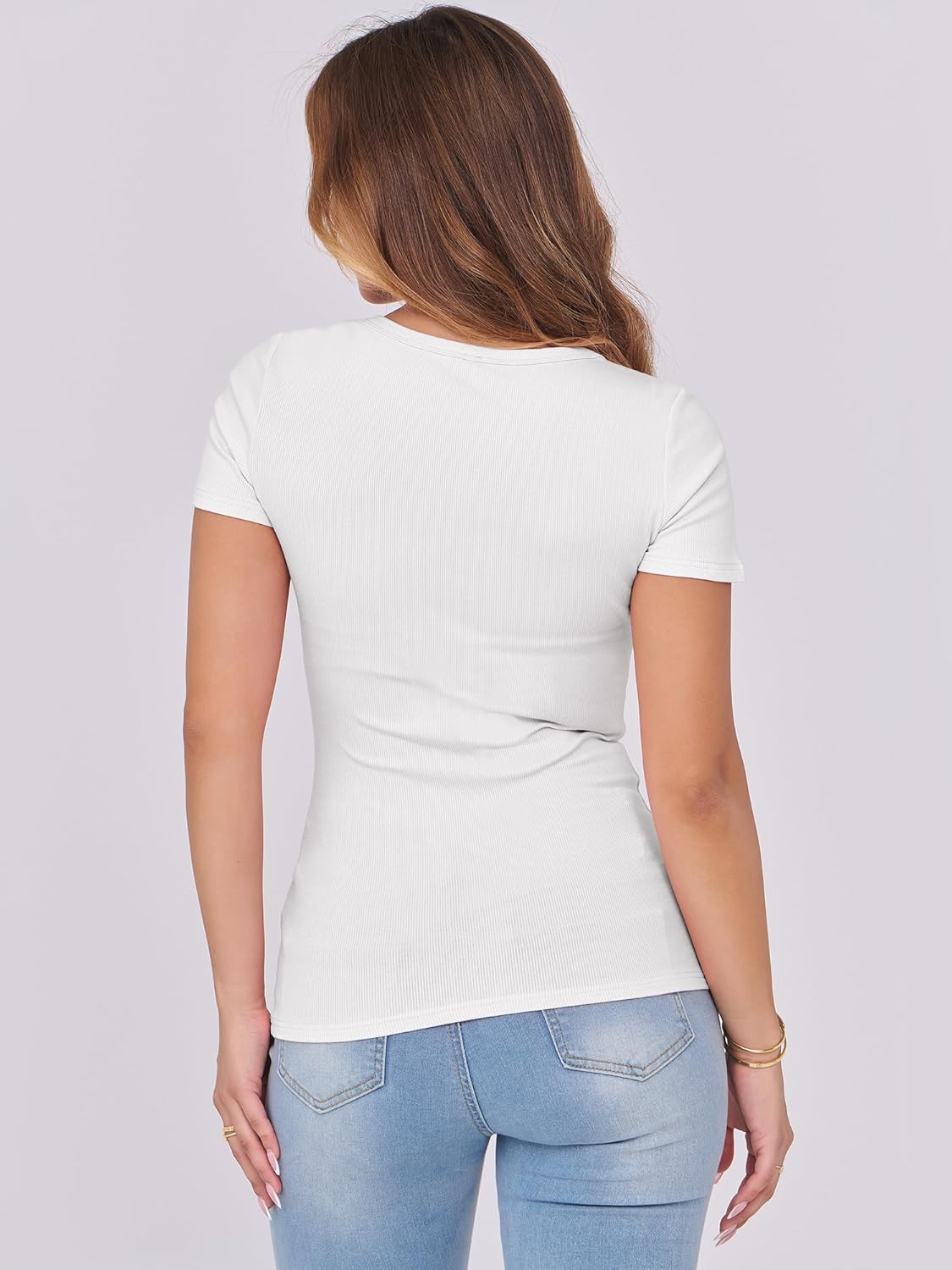 ANRABESS Women Short Sleeve Tops Scoop Neck Ribbed Knit Slim Fitted Basic Tee Shirts 2025 Casual Summer Trendy Clothes