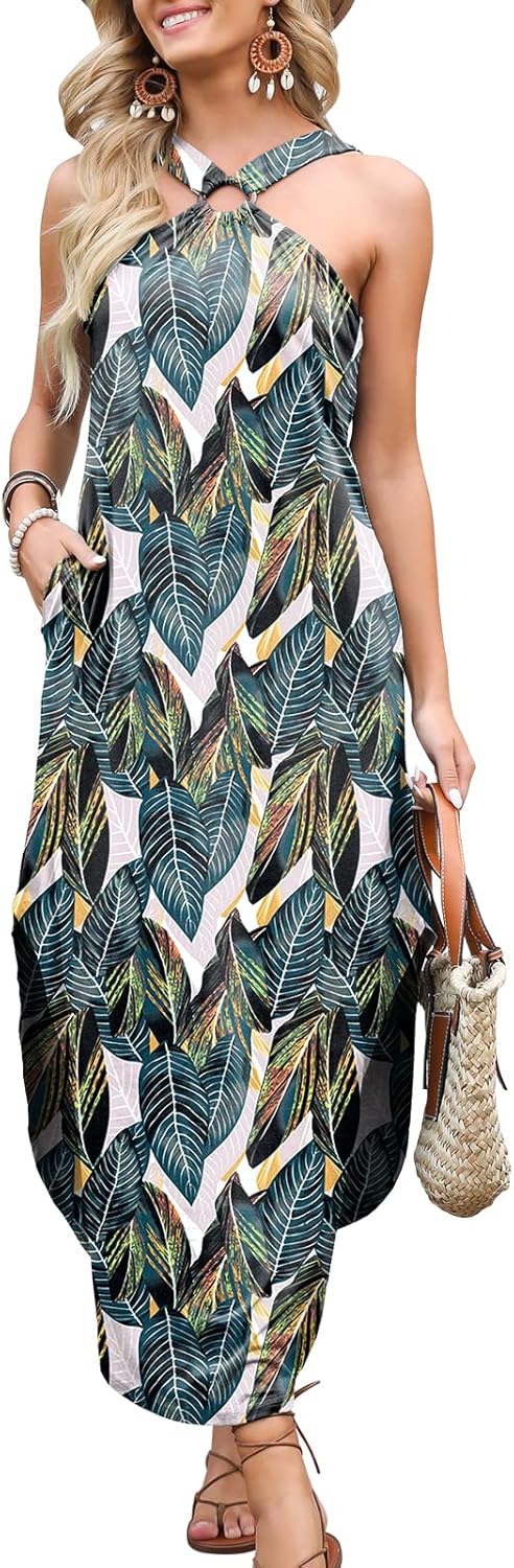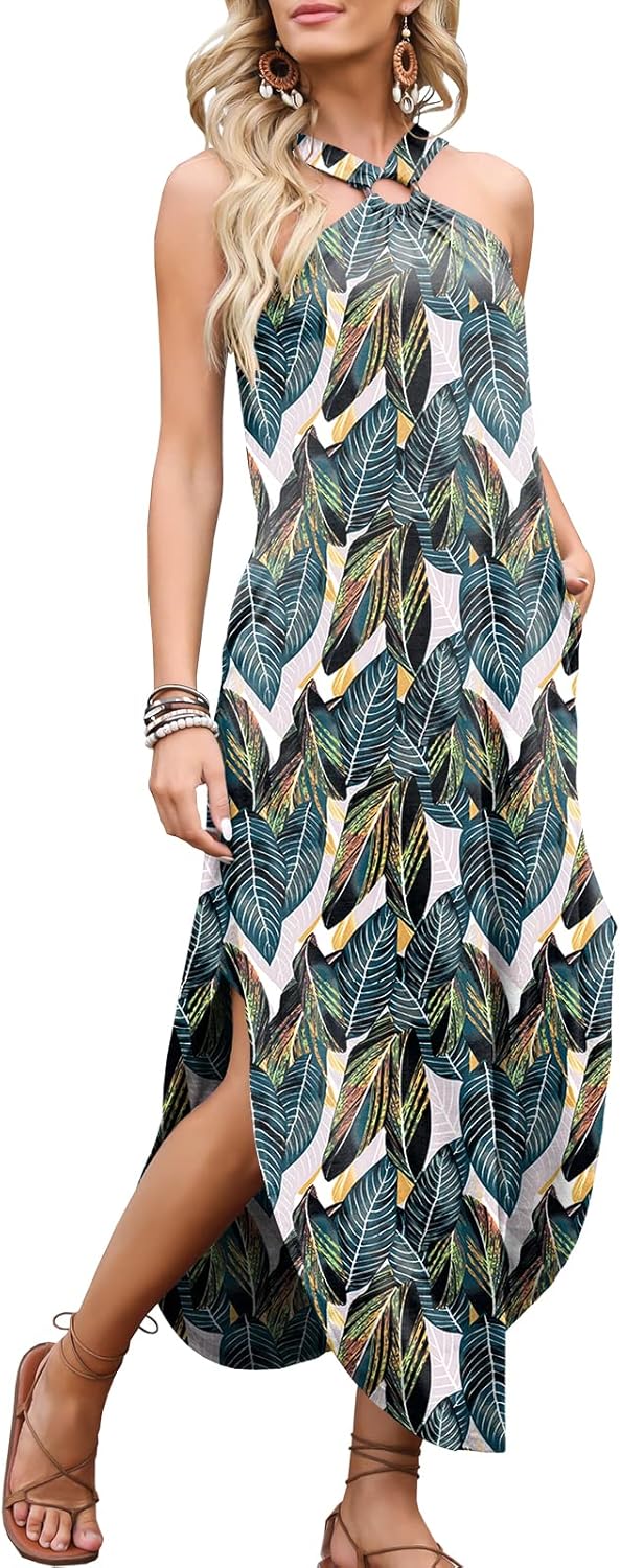 ANRABESS Women Summer Halter Neck Sundress Sleeveless Split Side Casual Beach Travel Vacation Maxi Long Dress with Pockets
