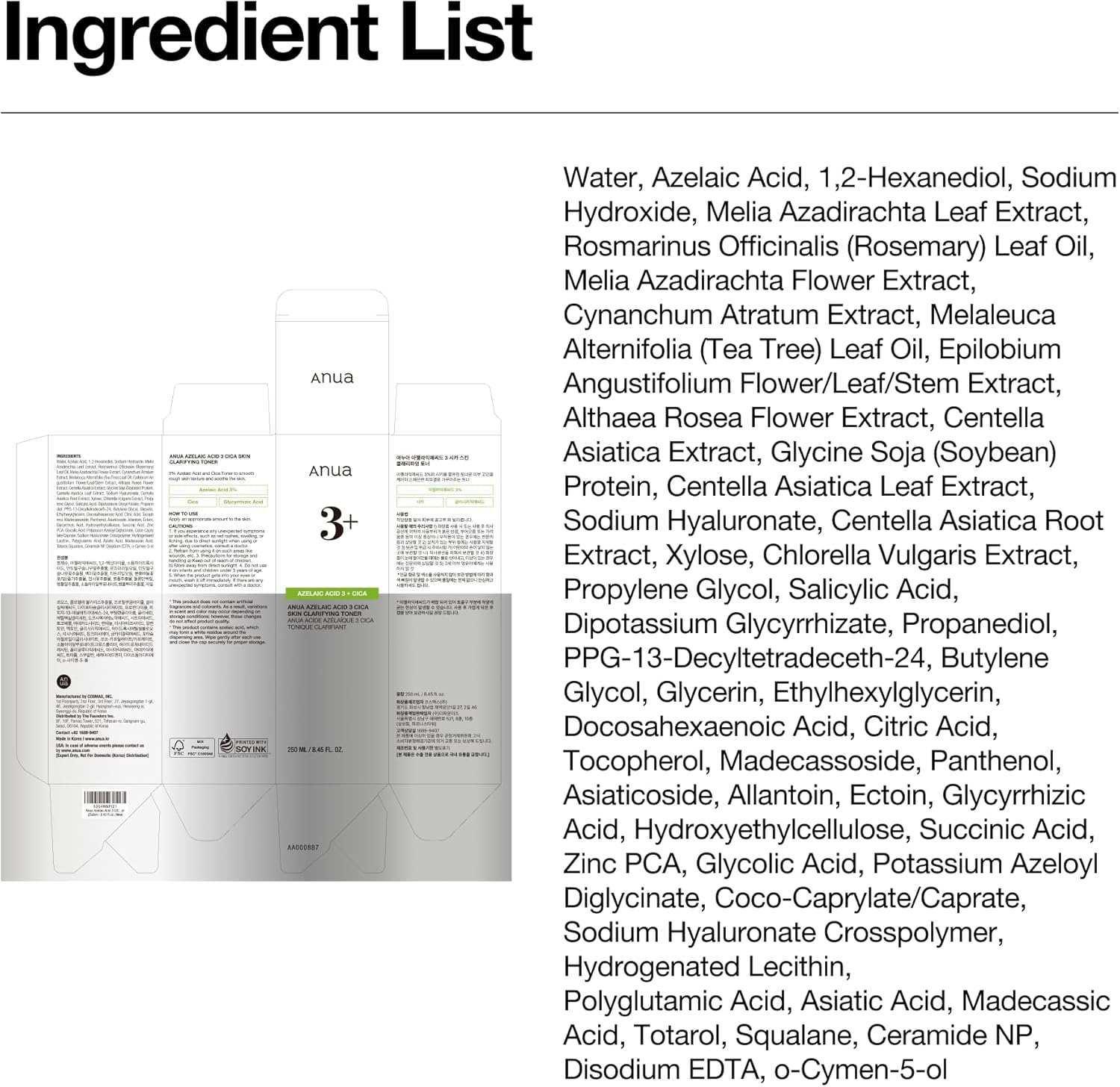 Anua Azelaic Acid 3 CICA Skin Claryfing Toner, Soothing & Clear Care, with Salicylic Acid & Azelaic Acid, Sebum & Spot Care, Suitable for Sensitive Skin, Korean Skin Care (250ml / 8.45 fl.oz.)