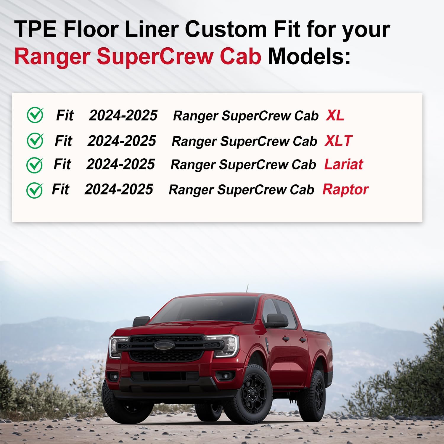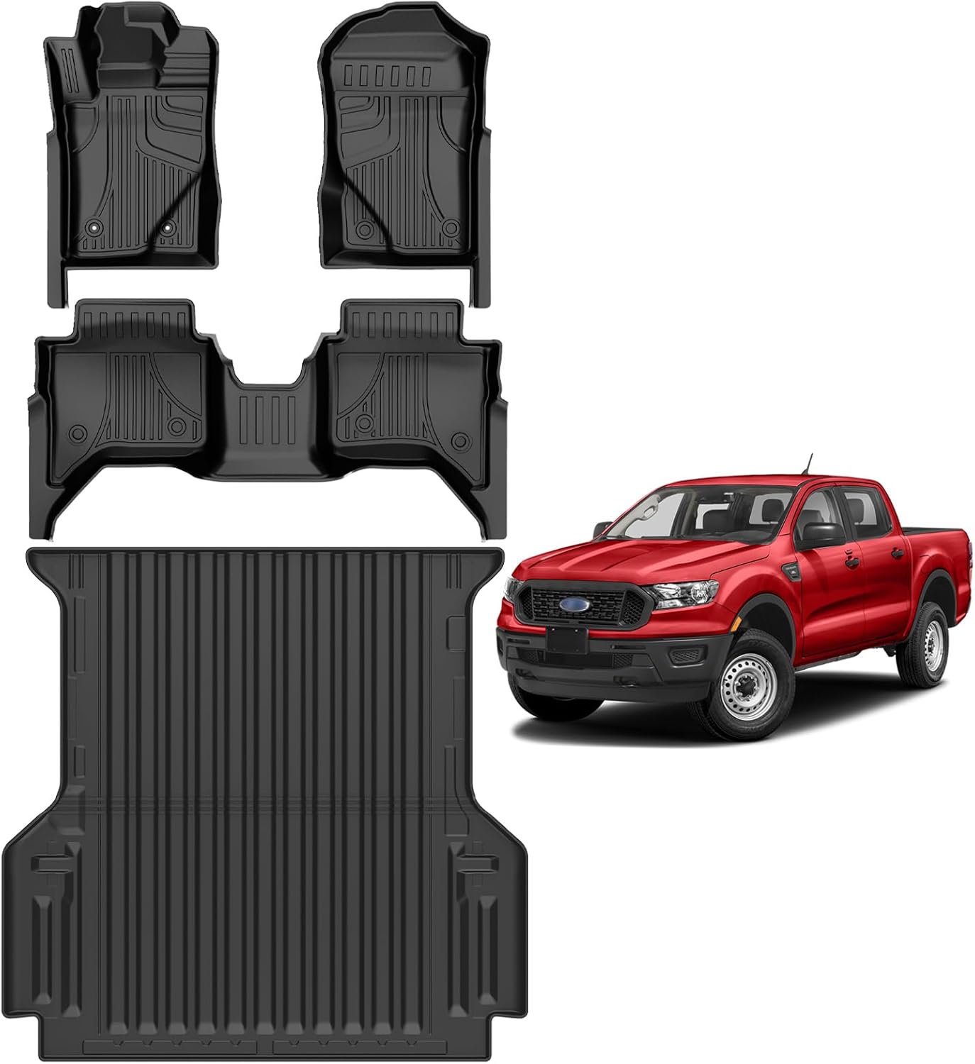 【Custom Fit for Ranger】The floor mats and 5ft bed mat compatible with Ford Ranger 2024 2025 Super Crew Cab, no need trimming. The car mats include front and rear row floor mats, bed liner. Adopts 3D screening technology to capture every corner and crevice to offer perfect fit and coverage.