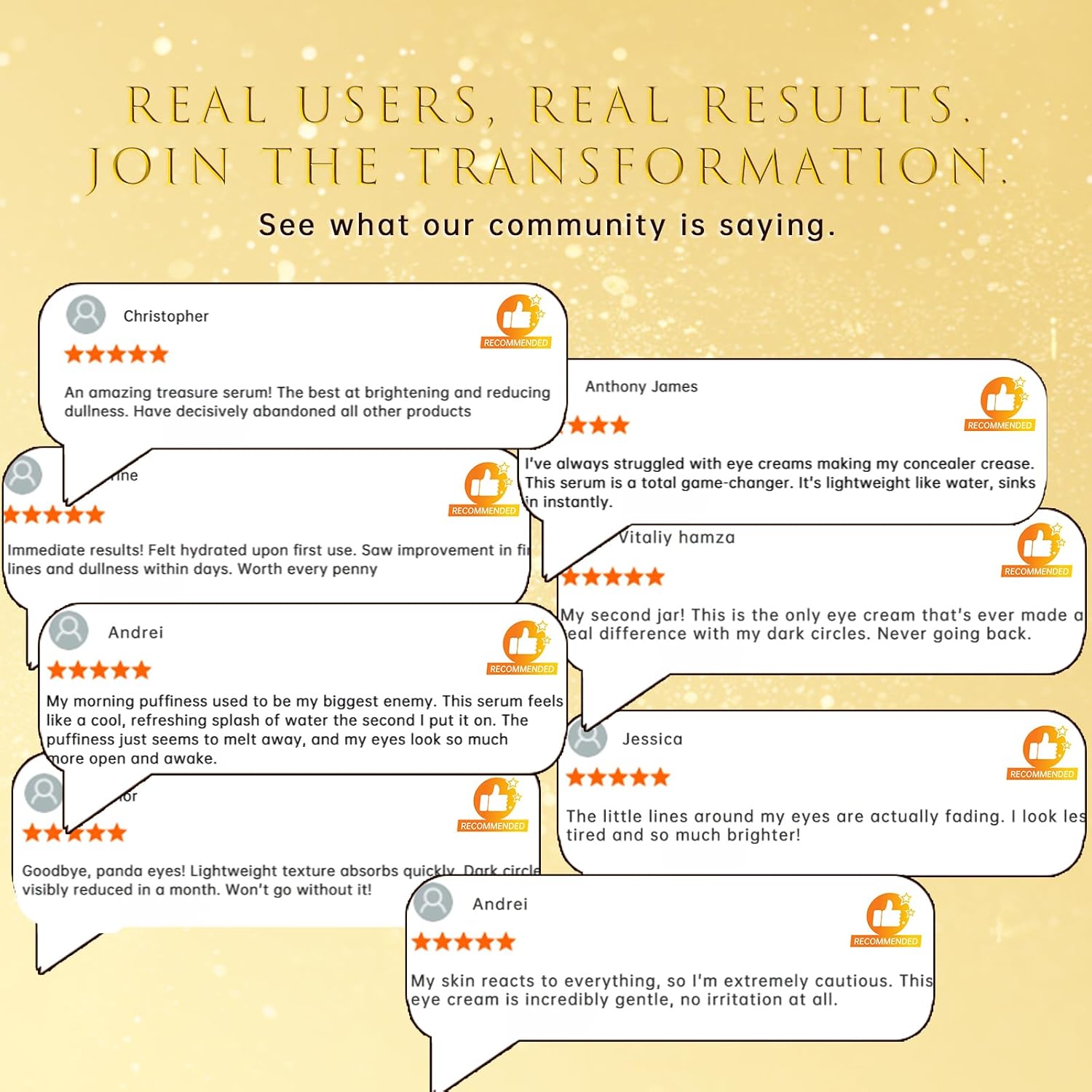Customers find this eye cream effective at improving eye contour and reducing puffiness, with one customer noting significant improvements in dark circles and shadows. The cream has a silky texture that’s gentle on the skin and absorbs quickly into the thin skin around the eyes, leaving it hydrated and firmer. They appreciate its elegant black and gold packaging and its ability to make eyes look refreshed and less tired.