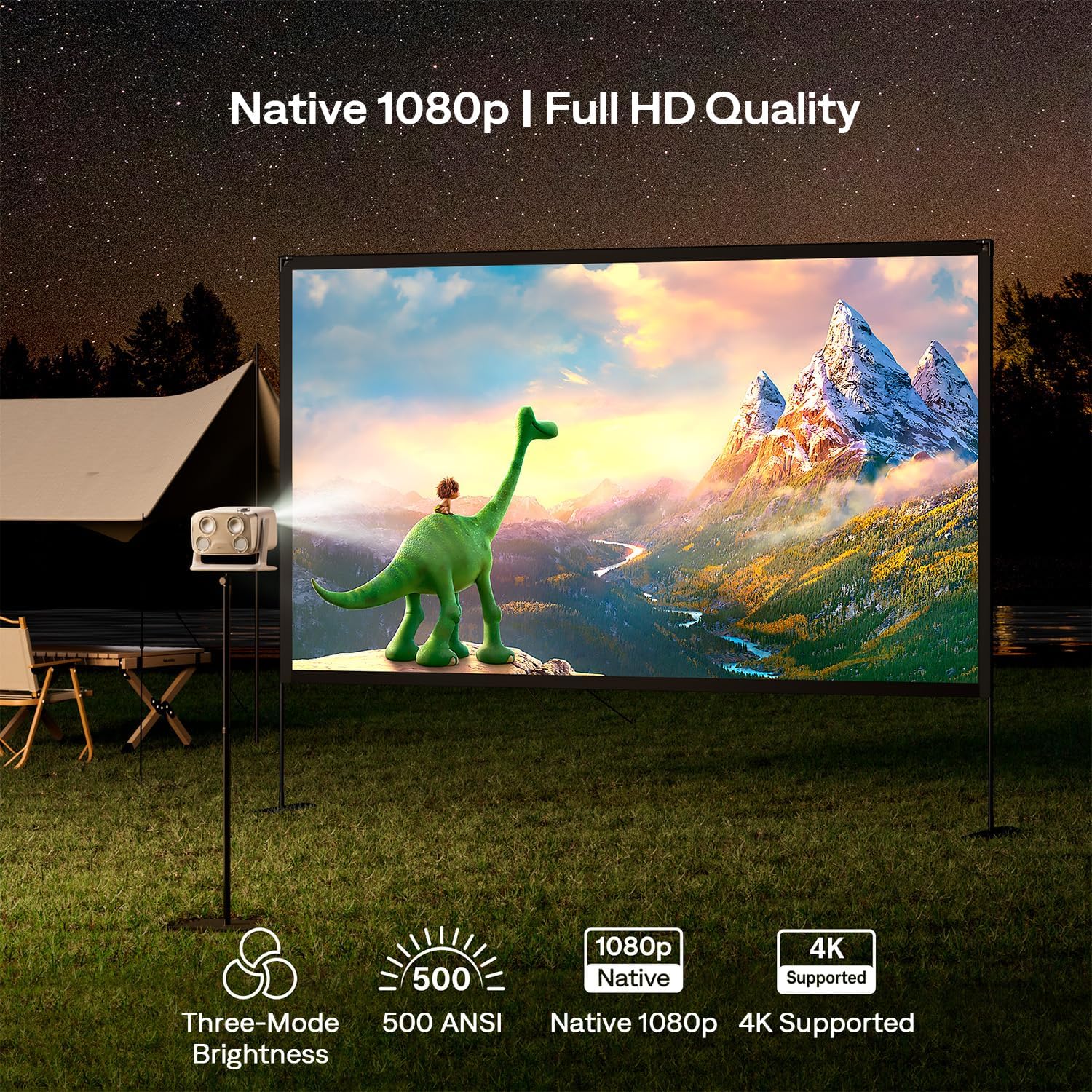4K Supported, 500 ANSI Lumens: With 500 ANSI authentic lumens and HDR10, BOOM mini outdoor projector delivers true-to-life colors and crisp 1080p visuals (Native 1080p & 4K supported), ensuring stunning clarity even in well-lit environments. Aurzen strictly measures brightness per ANSI (ISO/IEC 21118) standards and avoids any brightness exaggeration. (NOTE: Playing 4K content at native 1080P resolution requires a 4K device like a TV stick connected via HDMI.)