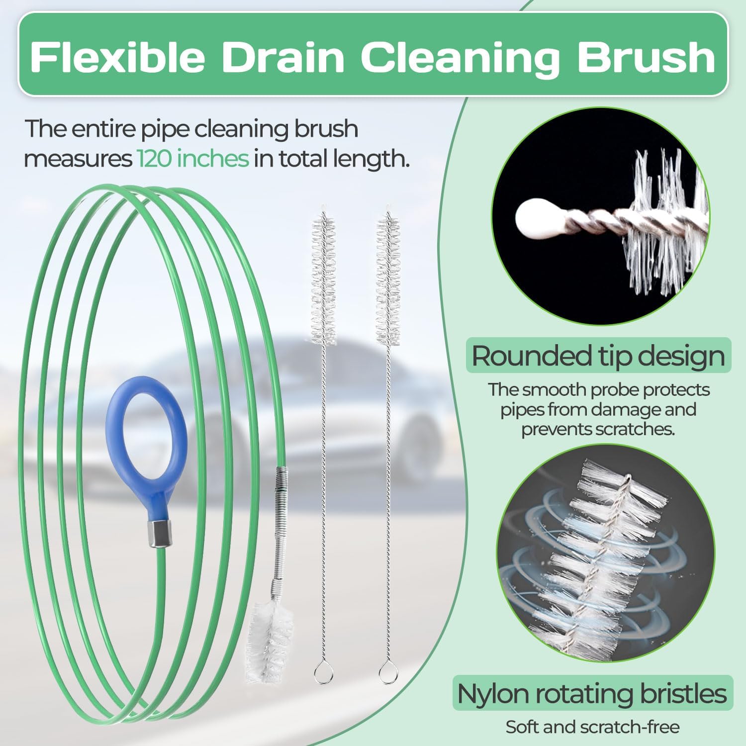 Auto Sun Roof Drain Cleaning Tool,120in Flexible Pipe Brush with 2Pcs Tube Cleaning Brushes for Automotive Sunroofs and Windshield Wiper Drain Holes (Green 120in)