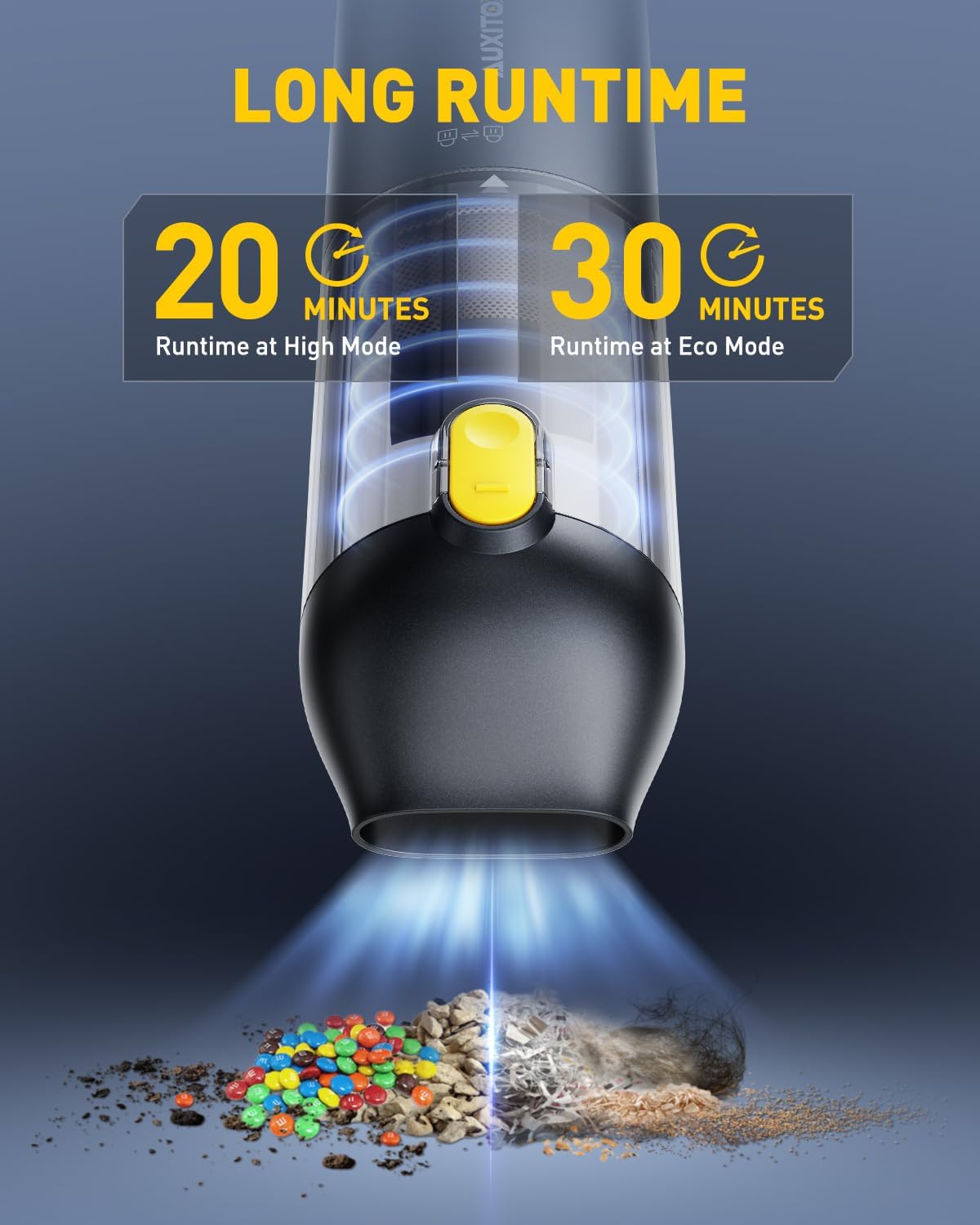 【14000PA HIGH POWER SUCTION HANDHELD VACUUM】The upgraded high-speed brushless motor delivers 14000Pa of powerful suction to quickly and easily pick up stubborn sand, dust, and debris. 2 suction modes of 8500PA and 14000PA are available to meet your different cleaning needs. (If the vacuum cleaner is in a low battery state, you may feel weakened suction power when using the high speed mode, and you need to charge it in time when using the high speed mode continuously.)