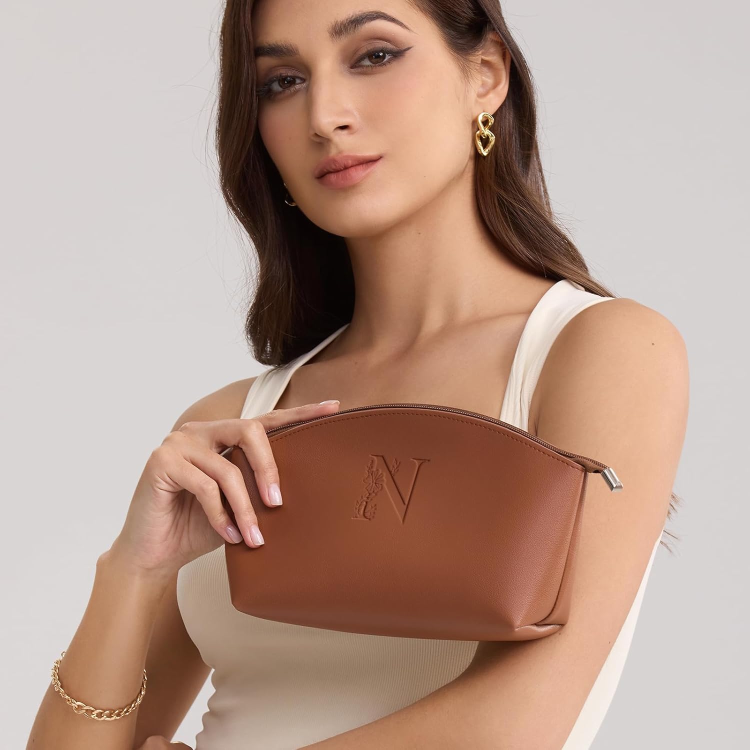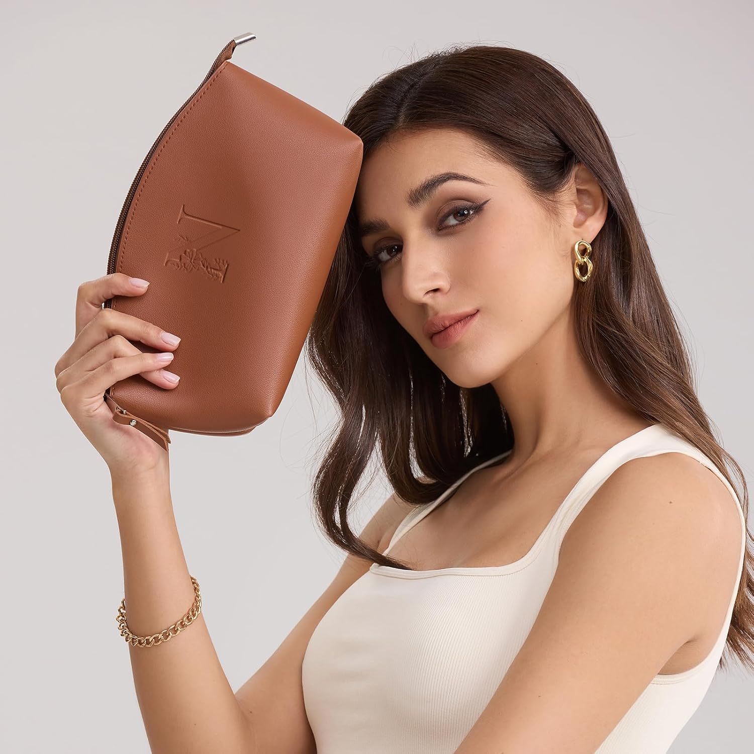 【MAKEUP BAG DESIGN】:The makeup bag measures 9.6″ x 5.9″ x 2.9″, compact and exquisitely crafted. Brown in appearance, full of texture. It features a zip closure that ensures everything is secure and tightly packed. Inside, there are two additional small pockets for extra storage.