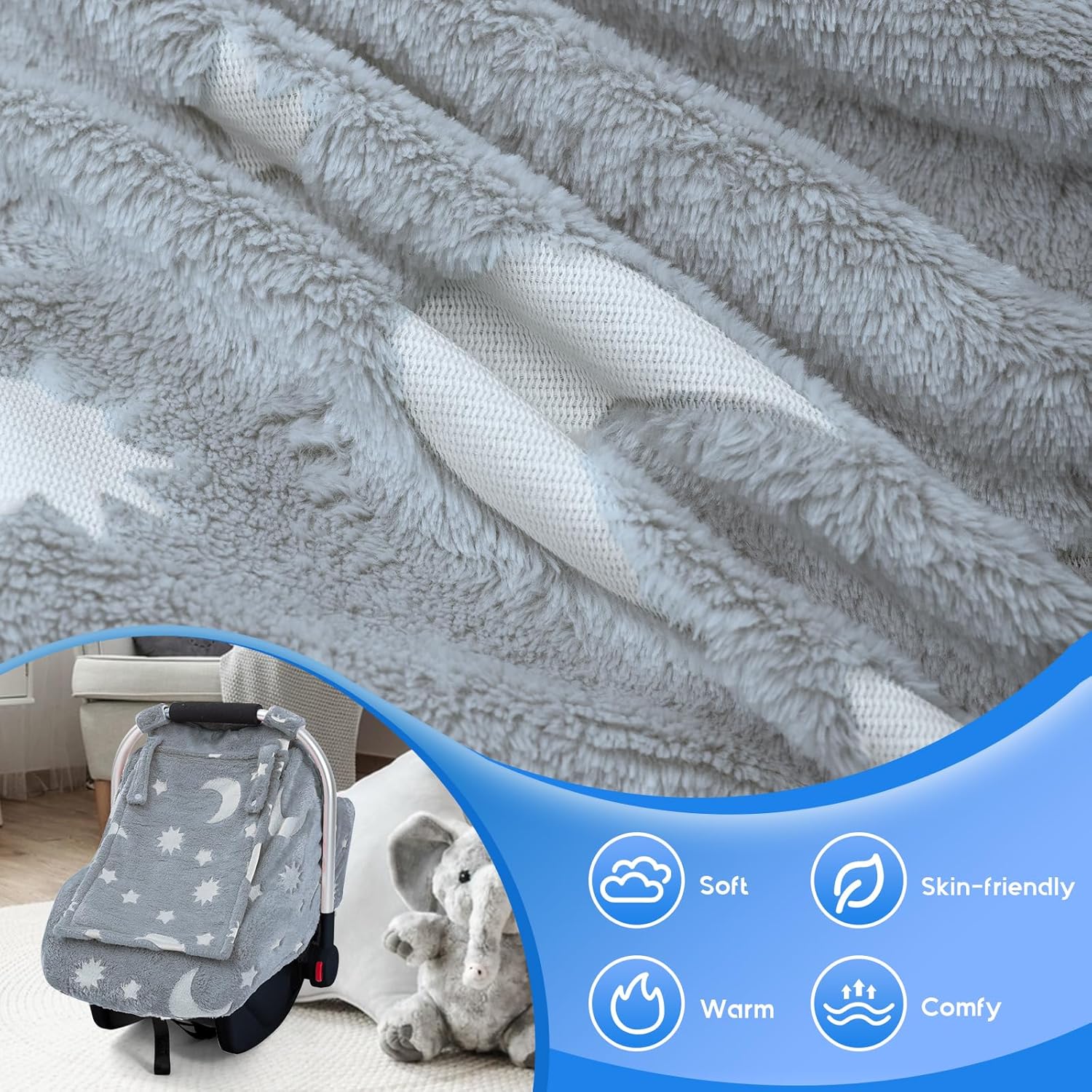 Fleece Plush Baby Car Seat Cover: Made of premium ultra-fine soft fleece plush material, which can significantly reduce the accumulation of dust, hair and other particles and prevent the baby from inhaling it. It can also be used as a sunshade cover, Breathable fabric ensures comfortable travel in the sunlight, create a warm and cozy environment for your little one.