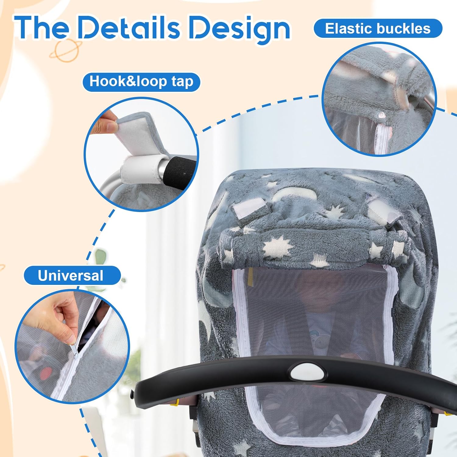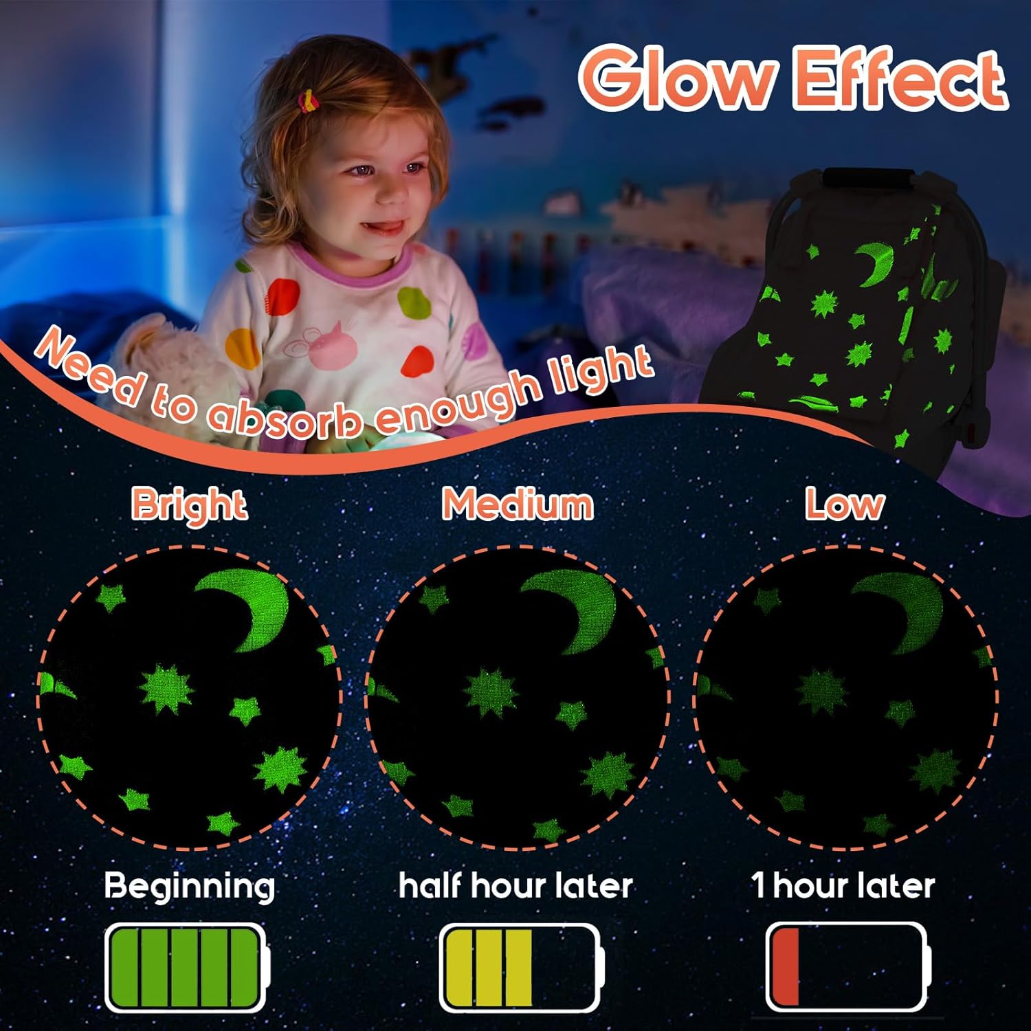 Carseat Cover Glow in The Dark: This Infant car seat cover has a glowing effect in the dark. When it absorbs sufficient light, the fluorescent effect will last for 1 hour in the dark and gradually weaken over time. It can attract the curiosity of babies, It can divert baby’s attention, and the specially designed appearance will make your friends envy.