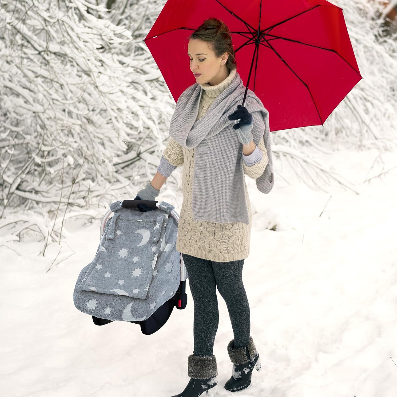 Carseat Canopy with 2 Screen Cover: It has 2-layers protection cover. The plush cover can block the sunlight to prevent strangers from peeping. When used in cold weather, the breathable and warm space inside can protect baby from the bad weather. The one with mesh window can effectively prevent elements from falling near the baby, and you can keep an eye on the baby’s condition at any time.