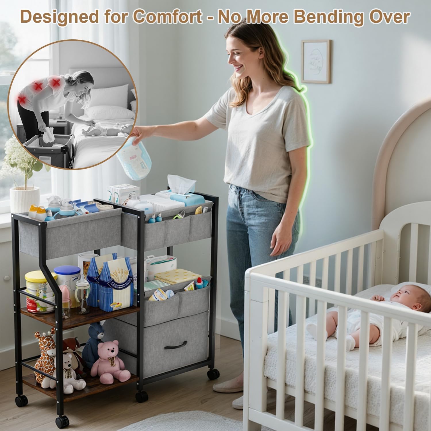 【Perfect Height for Mom’s Comfort】: Standing at 33.5 inches tall, this baby caddy organizer is designed to reduce bending and straining. Everything is within easy reach, making those late-night diaper changes and quick clean-ups a breeze!