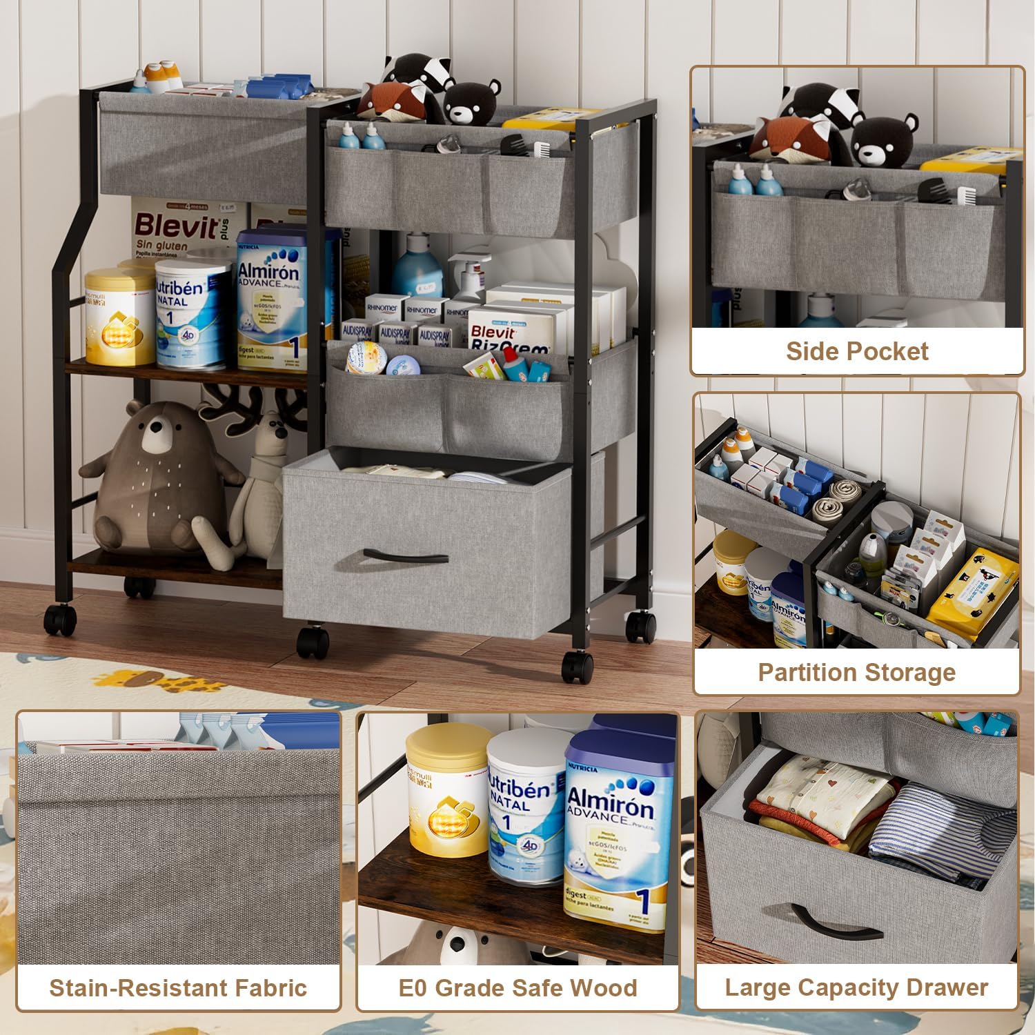 【Spacious & Organized Storage Cart】: With multiple tiers and smart compartments, this baby diaper caddy organizer cart offers ample space for everything your little one needs. 3 soft fabric bins perfect for storing diapers, wipes, tissues, and other daily necessities. Features sturdy wooden shelves ideal for heavier items like milk bottles, formula cans, and baby care products. Includes a convenient drawer and additional storage space for baby clothes, bibs, toys, and more!
