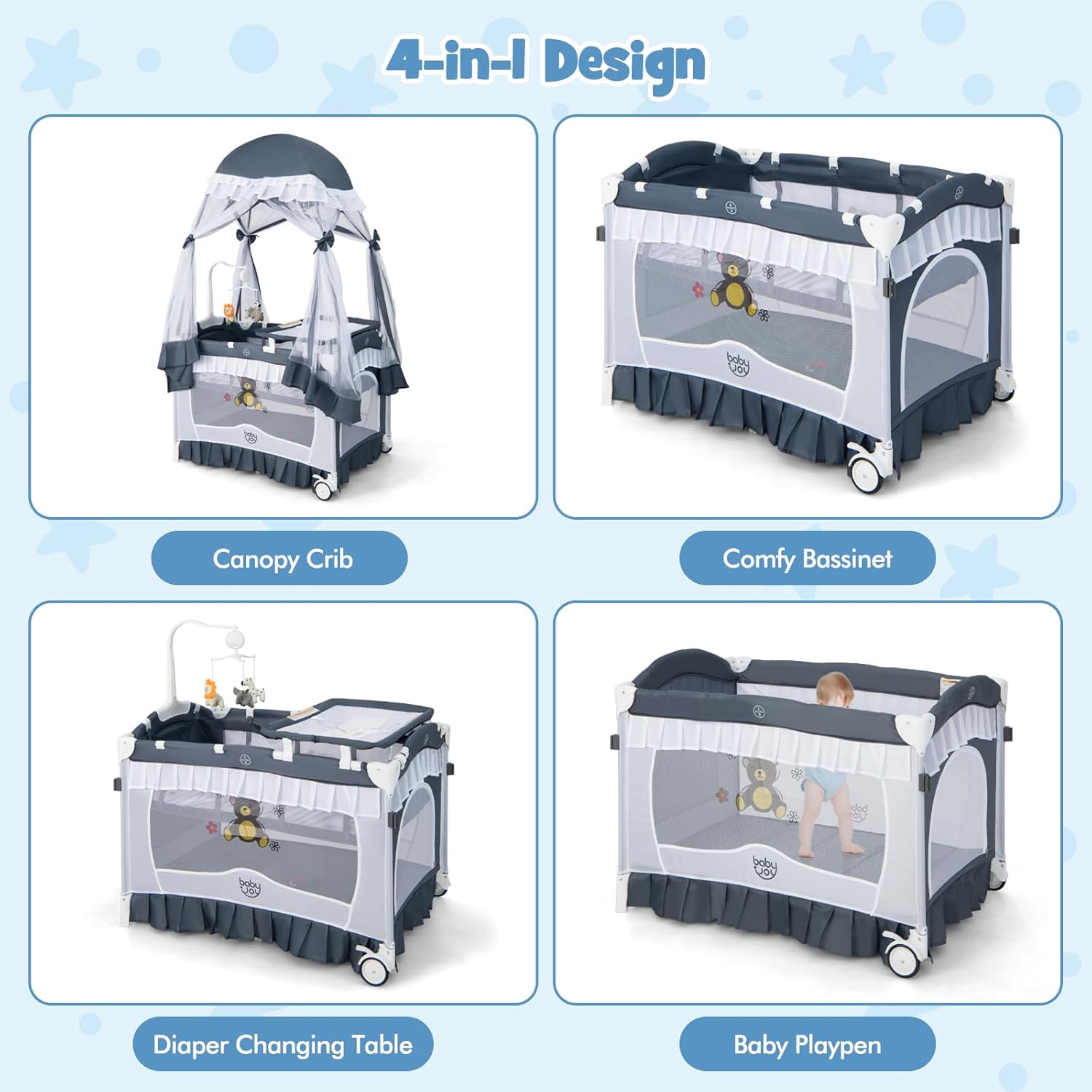 【BABY JOY 4-IN-1 Pack and Play】Our multifunctional nursery center designed to transit from newborn to infant to toddler. We can serve as a activity center, baby bassinet, bedside crib, water-resistant diaper changing table, playpen. Whether it provides a comfortable resting place for your cute baby, or daily activities and care, this 4-in-1 baby crib is the best choice.