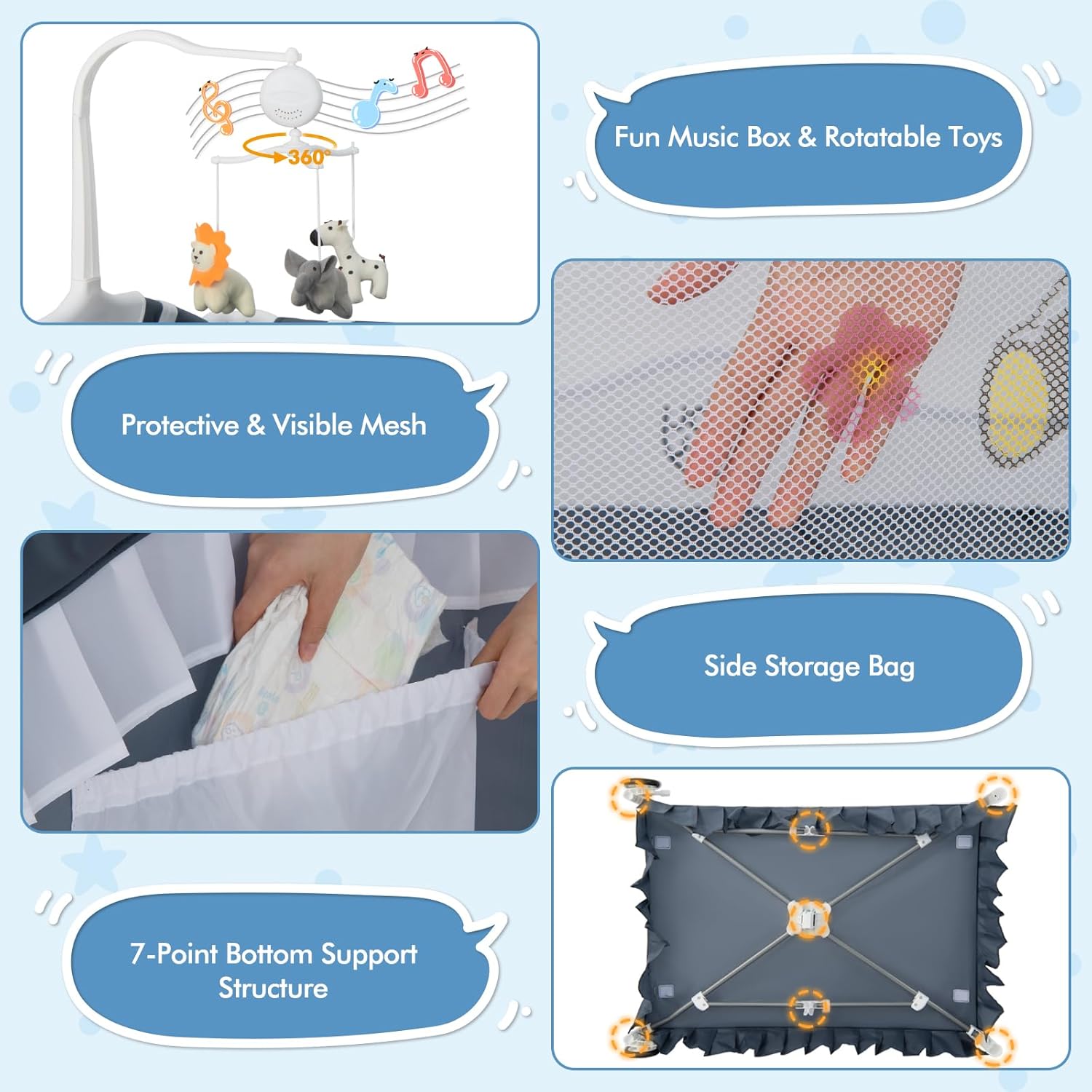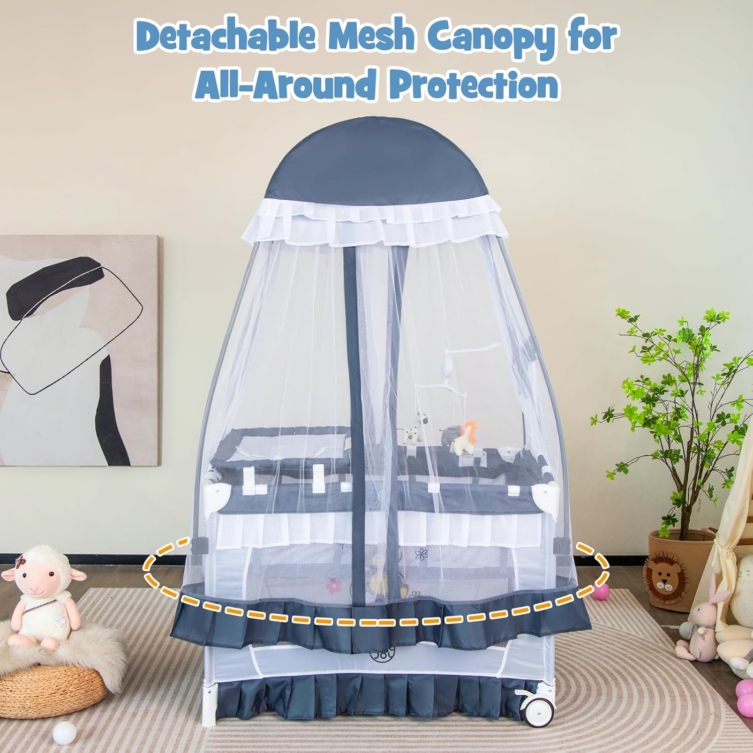 【Convenient & Flexible Babysitting】There are two universal wheels with brakes at the bottom of the baby playard so that it can move flexibly. The 3 different hanging toys attract the baby’s attention, not only promoting the baby’s visual development but also improving the grasping ability, and make them fall asleep. Made of sturdy iron tubes, this baby crib is stable enough for babies from 0-36 months old.