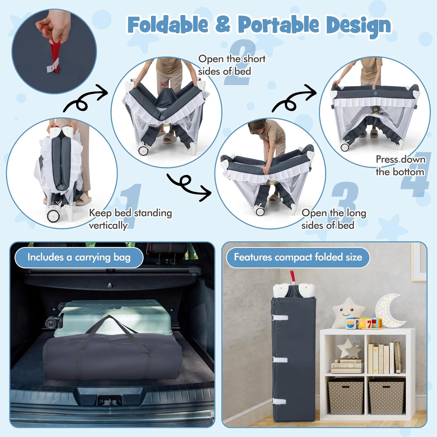 【Compact Folding & Easy to Carry】The diaper racks, extended canpoy, and bassinet can be easily removed from the baby playard. And the basic bed can be quickly folded up without extra tools. Equipped with a handbag helps you store the folded crib and provides a place for your baby to sleep when you go out to visit relatives or travel. NOTE: Only when the four sides are locked can the middle be pressed down; If you lock the middle part first, it will cause all four sides to fail to lock.