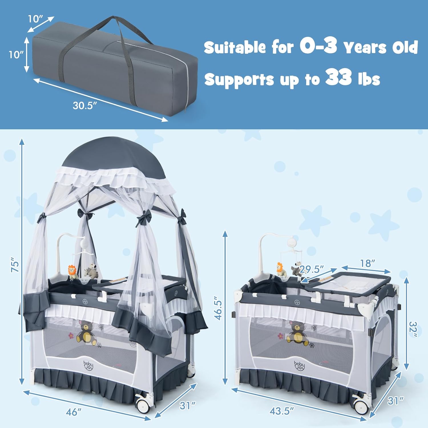 【Removable Extended Canopy】Different from other baby playards, this pack and play is equipped with a adjustable net which can better prevent your baby from being disturbed while falling asleep and create a better sleeping environment for your child. Weight Capacity of the Bassinet : 33 lbs. When not in use, the canopy can be easily put away or disassembled.