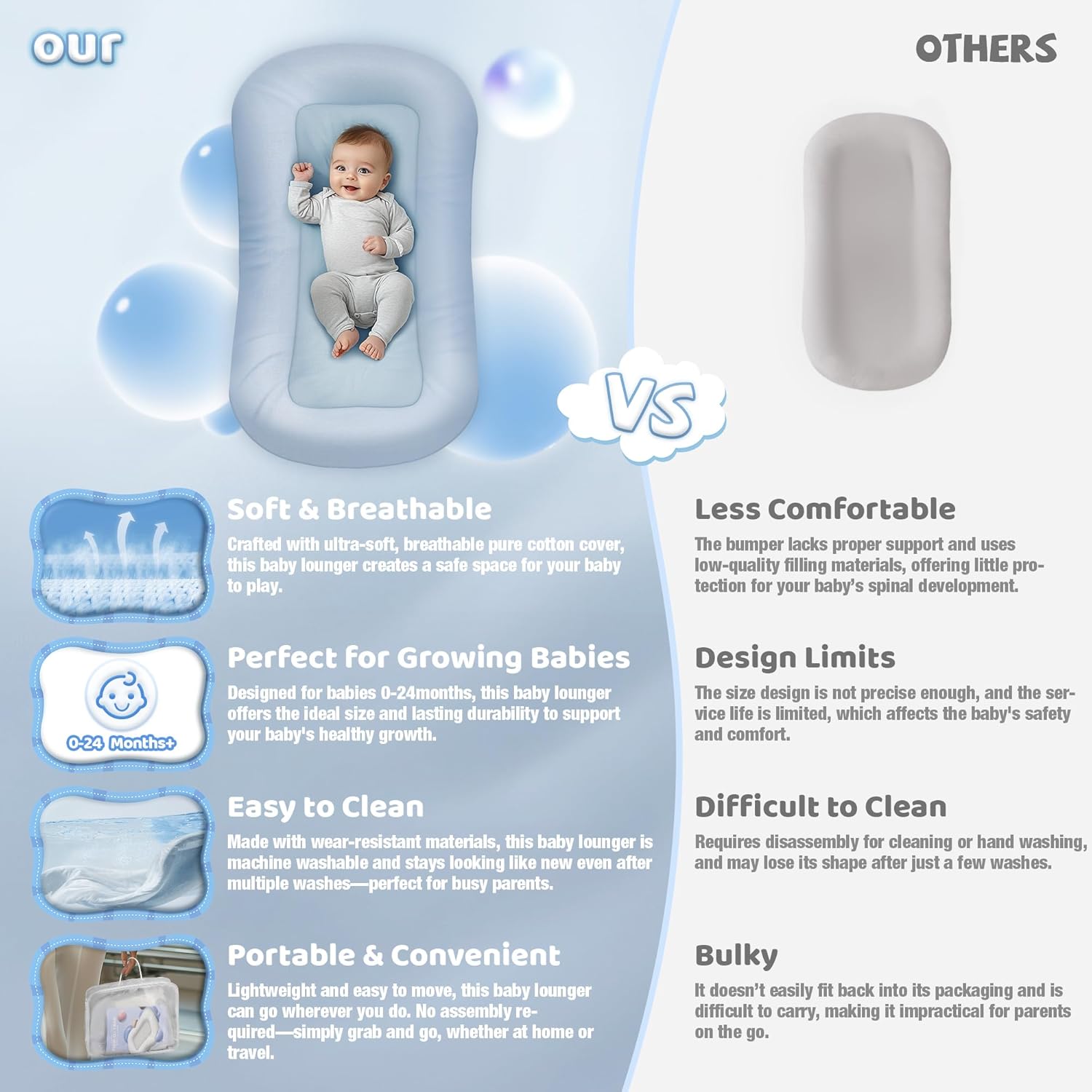 Durable and Easy to Clean for Busy Parents: Designed to stand the test of time, this baby lounger is made with high-quality, durable materials that can handle all of your baby’s movements. Machine washable! Cleanup is a breeze, making it the perfect solution for busy parents looking for a low-maintenance product that lasts