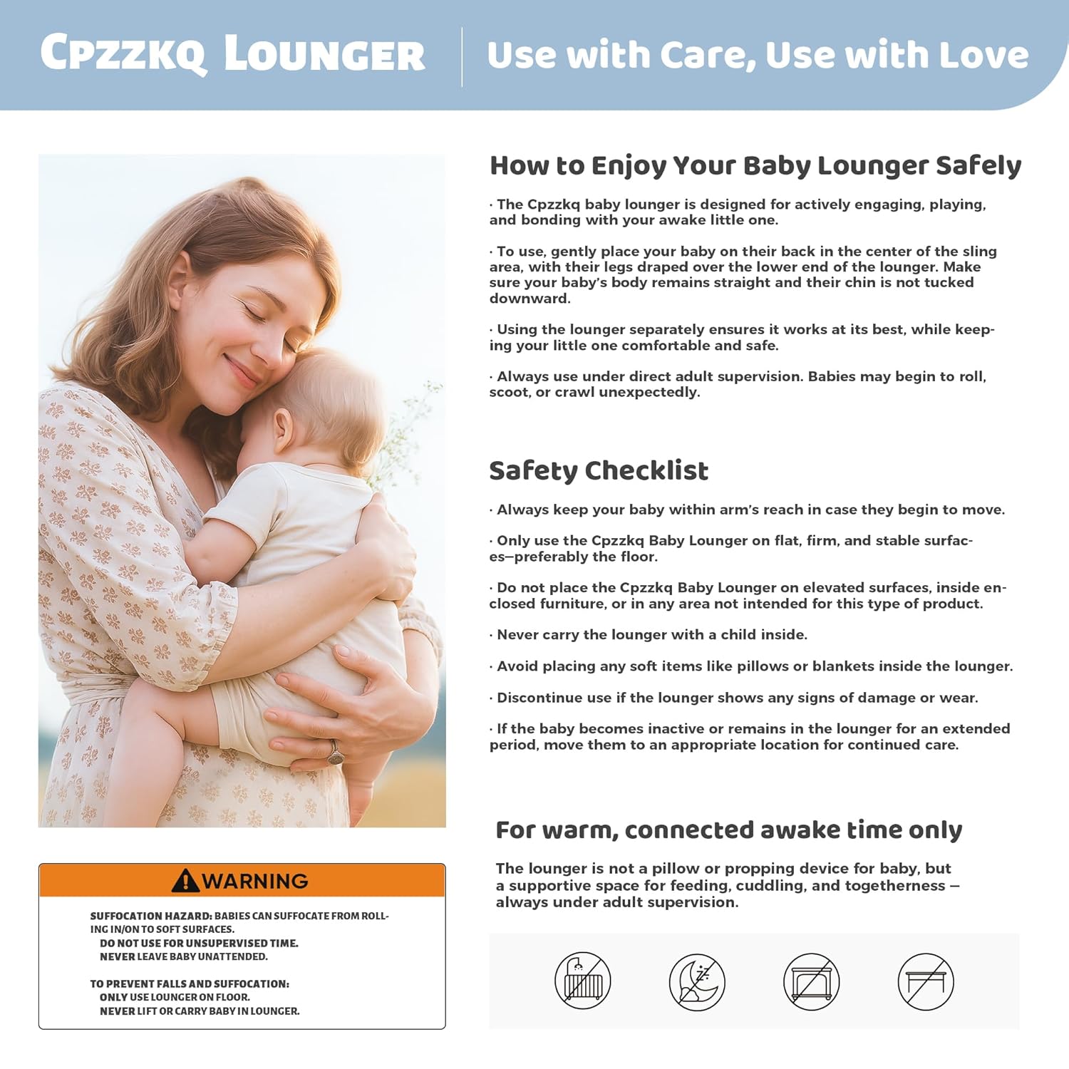 Just a Friendly Reminder: Create precious moments with your awake little one during playtime, bonding, or story time—this baby nest lounger is designed for supervised awake time, ensuring comfort and safety while keeping your baby close